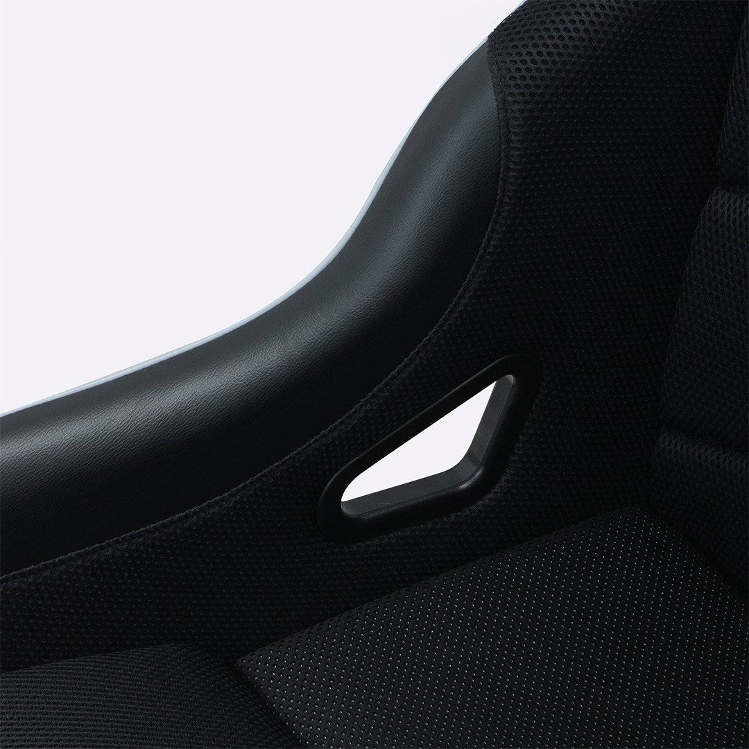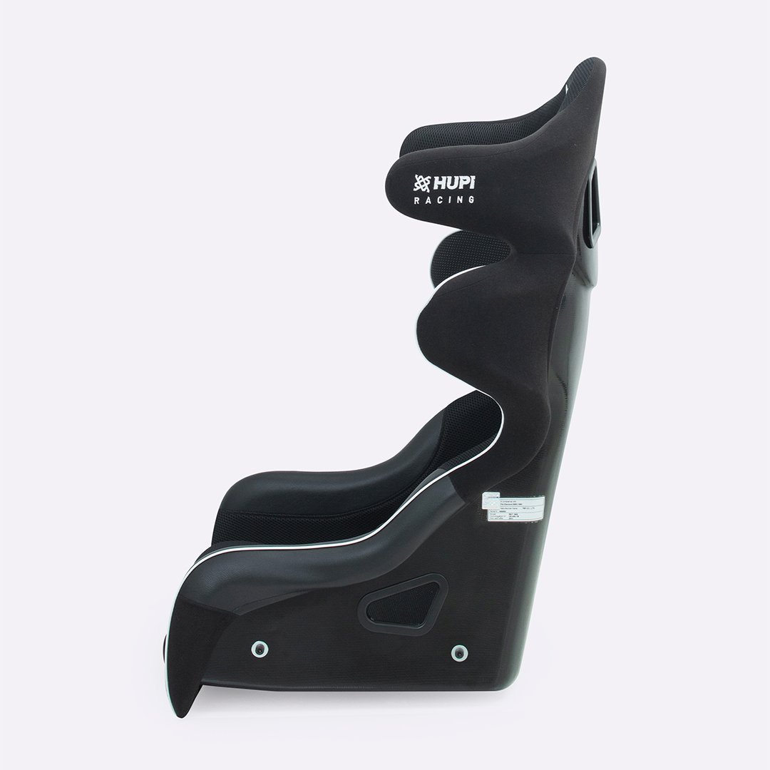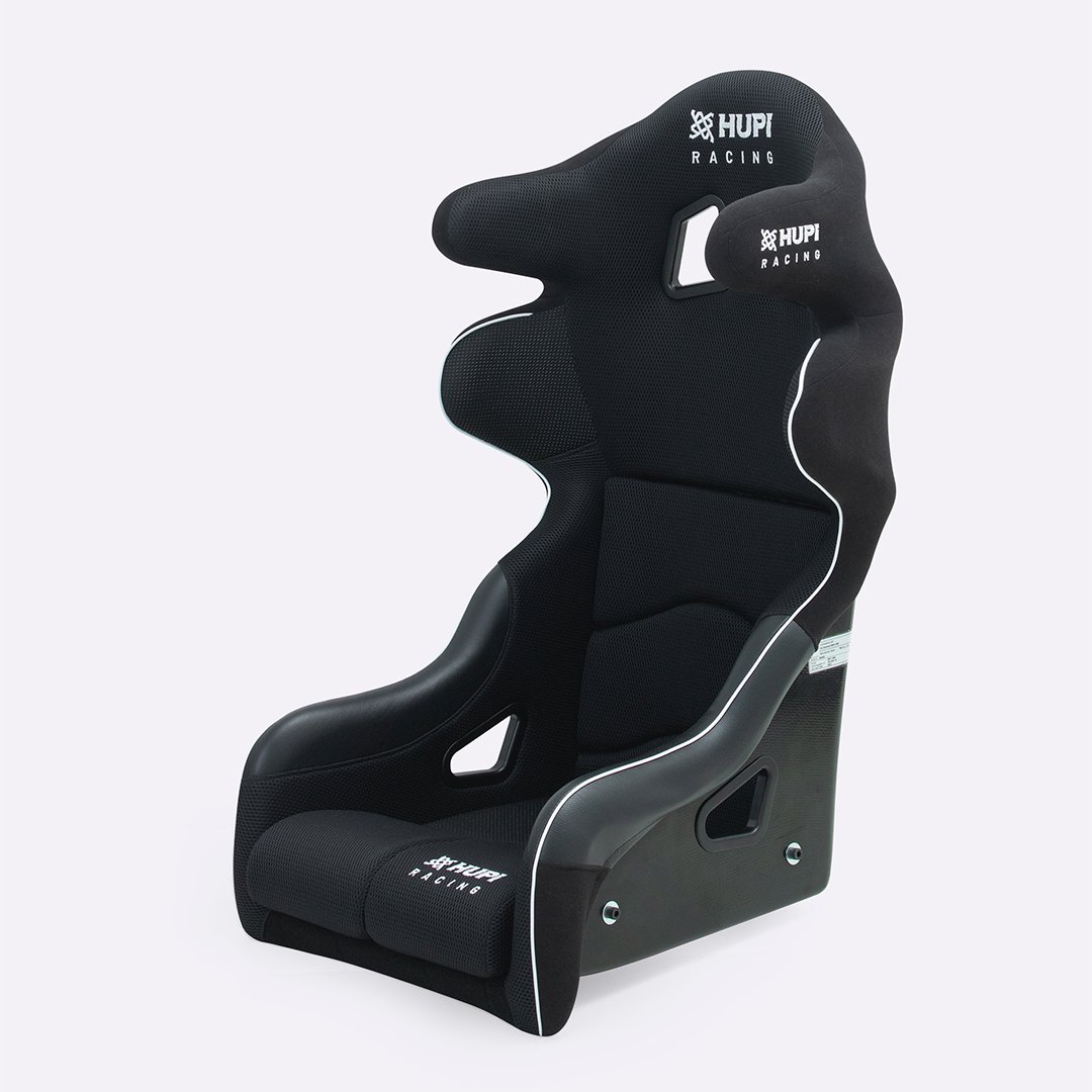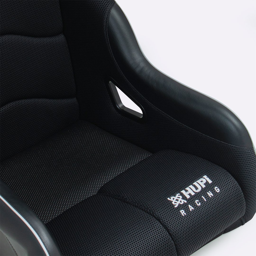 Na parte interna, o banco utiliza tecido mesh respirável com tecnologia HUPI Thermo Flow, desenvolvida para otimizar a ventilação e ajudar no controle de temperatura e do suor durante o uso. Isso garante mais conforto ao piloto, principalmente em sessões prolongadas e em condições de alta intensidade. Já o acabamento externo em velvet entrega um visual mais sofisticado, enquanto as laterais com revestimento em couro aumentam a durabilidade, especialmente em áreas de maior contato com o cinto de segurança.