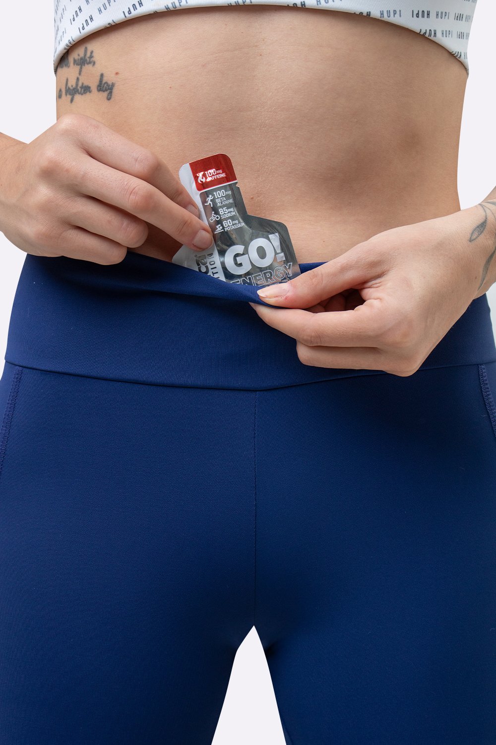 Na corrida, use os bolsos laterais para géis e o bolso do cós traseiro para chave e cartão, mantendo o peso centralizado.