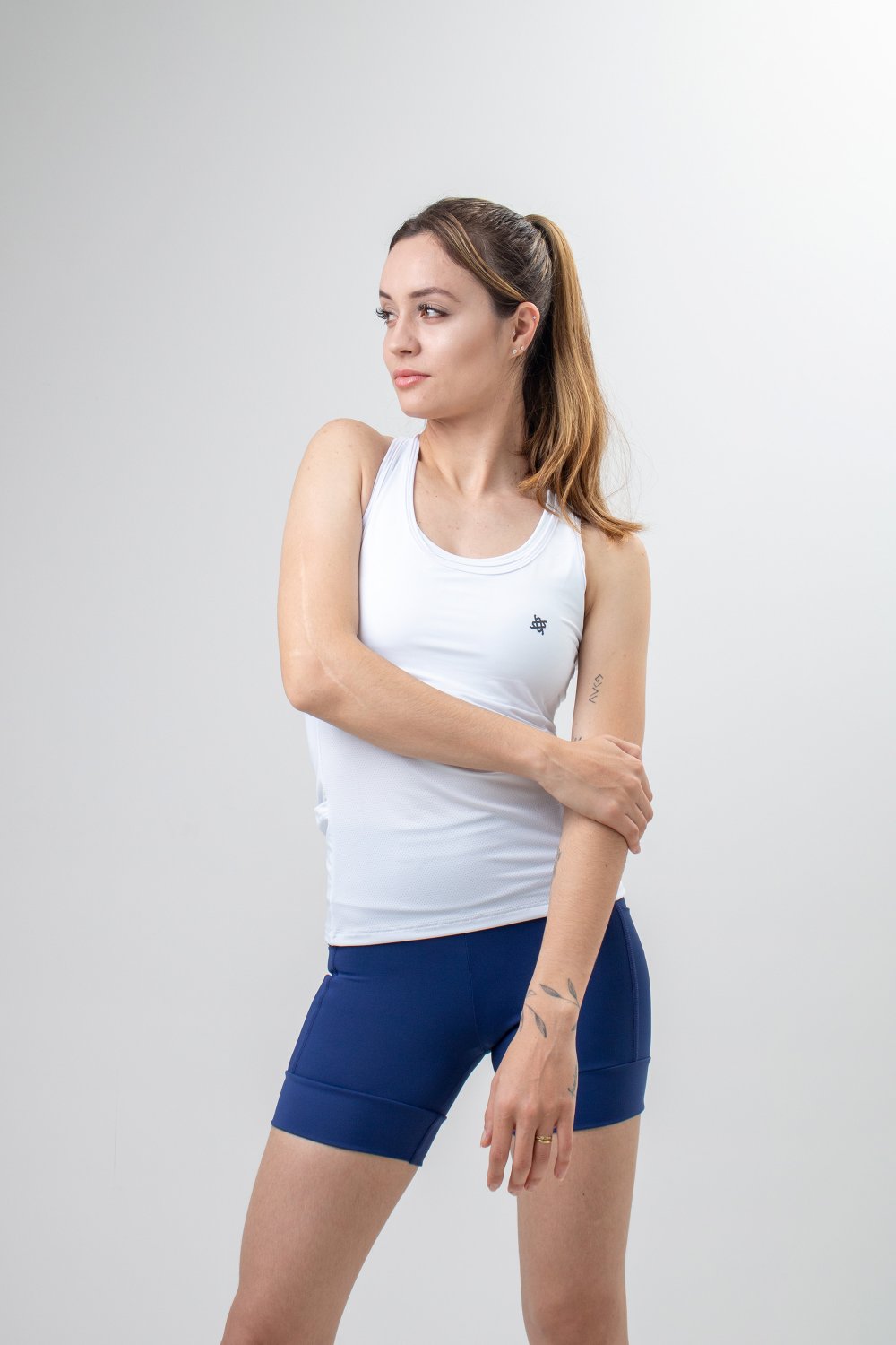 A experiência no corpo é de conforto contínuo. A modelagem anatômica valoriza a silhueta sem apertar onde não deve, as costuras são posicionadas para minimizar atrito e o tecido respira junto com o seu esforço, secando rápido para não acumular suor. O azul marinho combina fácil com tops, regatas e camisetas dry, montando looks esportivos versáteis que funcionam dentro e fora da academia.