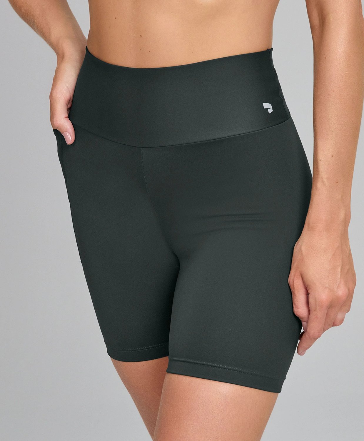 A elasticidade multidirecional facilita a amplitude dos movimentos, enquanto o cós alto e estruturado melhora o encaixe no quadril e evita que a bermuda desça ou dobre durante o treino.