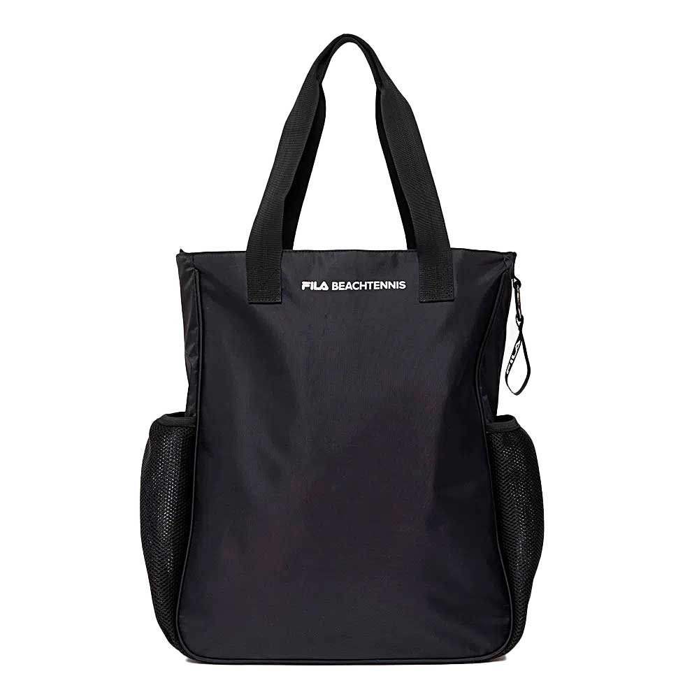 A Bolsa de Ombro Unissex Fila F-box Beach traz compartimento principal com fechamento em zíper e puxador personalizado, bolsos internos e lateral, e porta-raquete de Beach Tennis.
