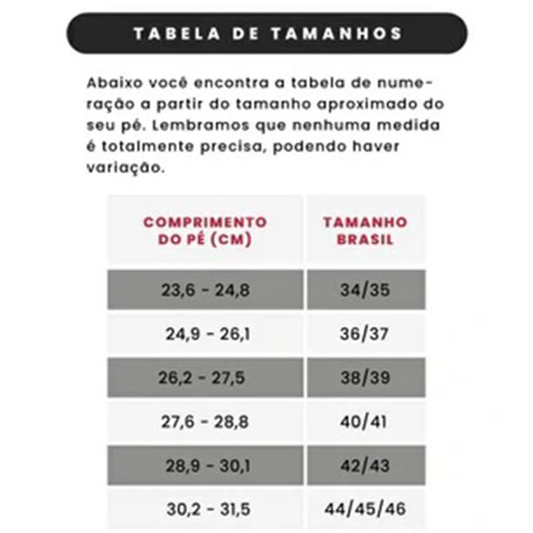 Indicamos comprar 1 número maior que o habitual, para melhor comparação verificar tabela de tamanhos.