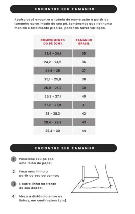 Indicamos comprar 1 número maior que o habitual, para melhor comparação verificar tabela de tamanhos.