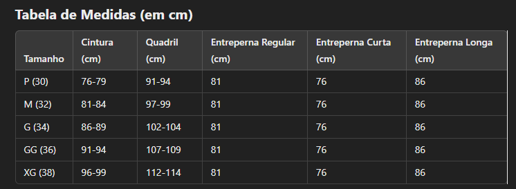 Material: 96% poliéster e 4% elastano, garantindo elasticidade e resistência