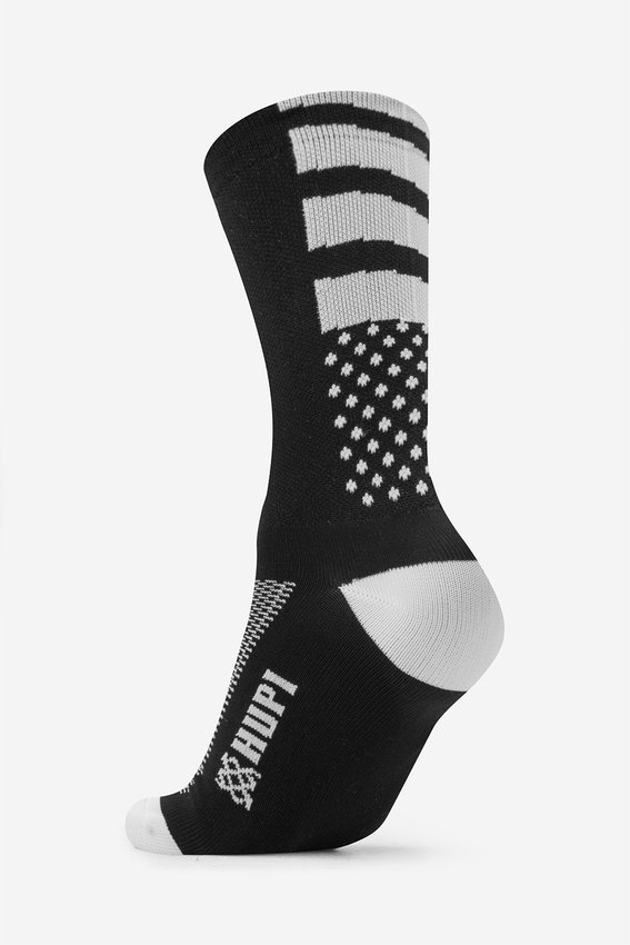 Meia HUPI Focus Preto e Branco: Feita com materiais de alta qualidade, evita calos e bolhas, mantendo seus pés secos e confortáveis a cada passo.
