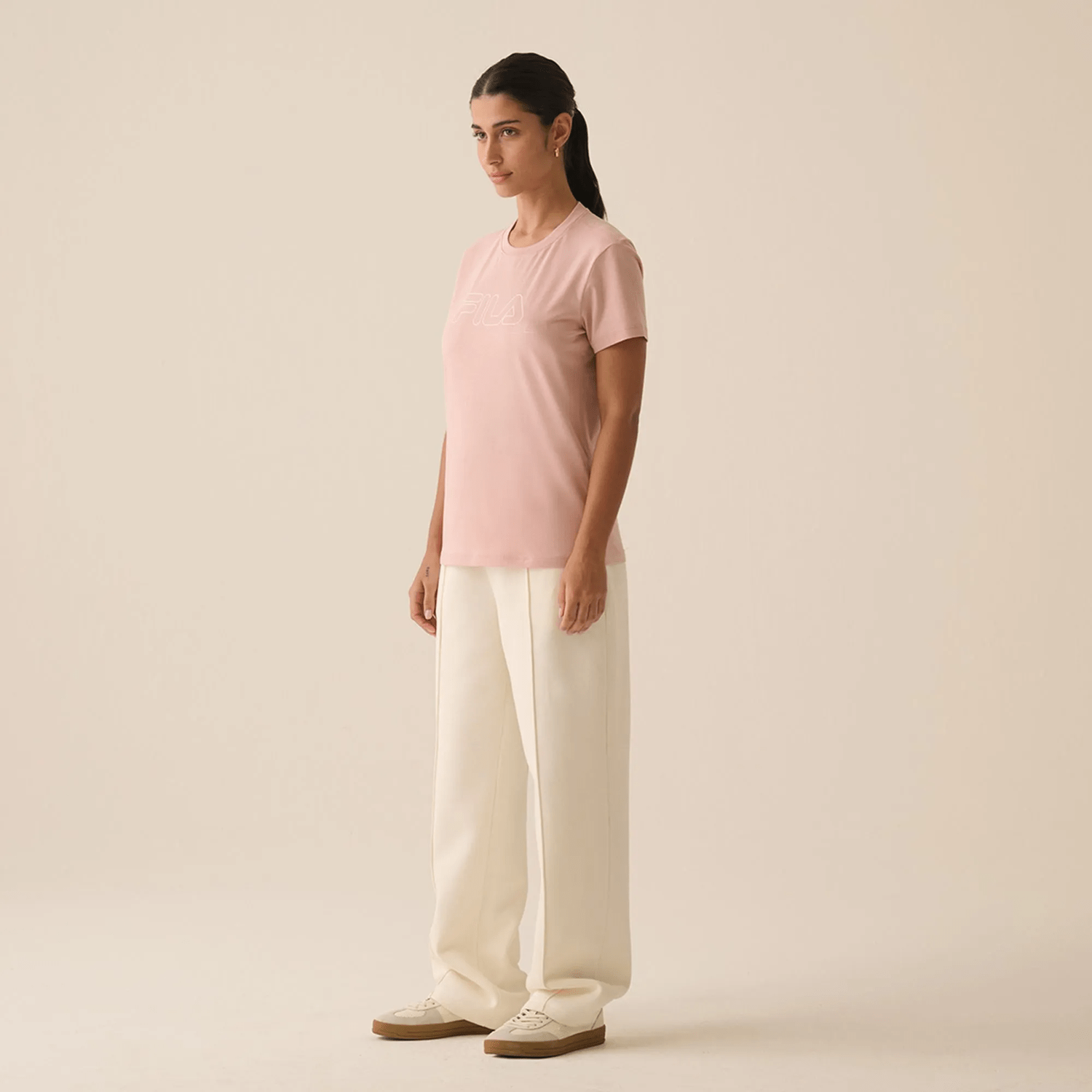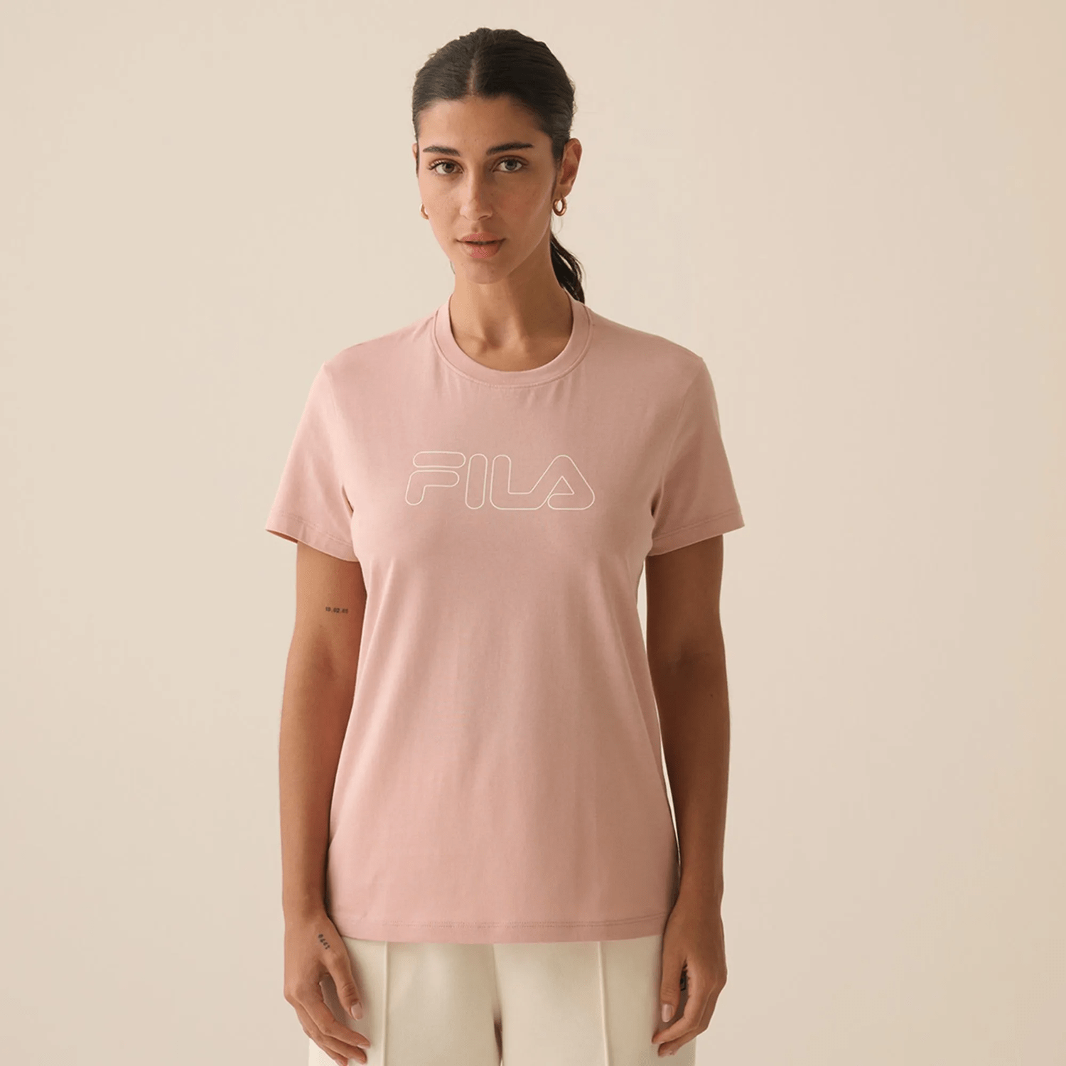 Com design minimalista e a logo Fila em outline no peito, a peça imprime identidade visual sem exageros, destacando-se pela elegância da cor rose.