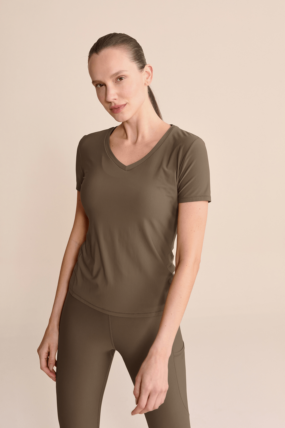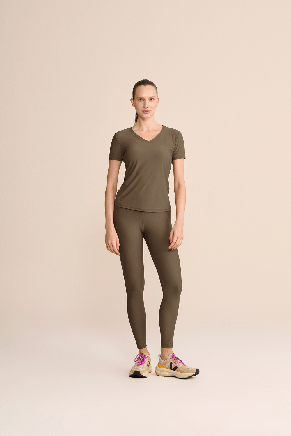 A modelagem slim com decote em V valoriza a silhueta sem apertar, enquanto a proteção UV 50+ garante tranquilidade mesmo em atividades ao ar livre.