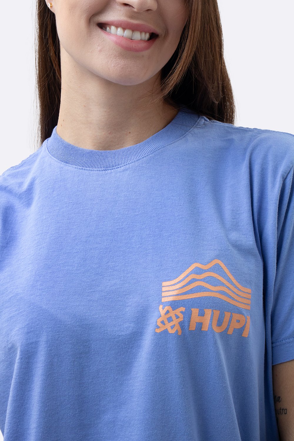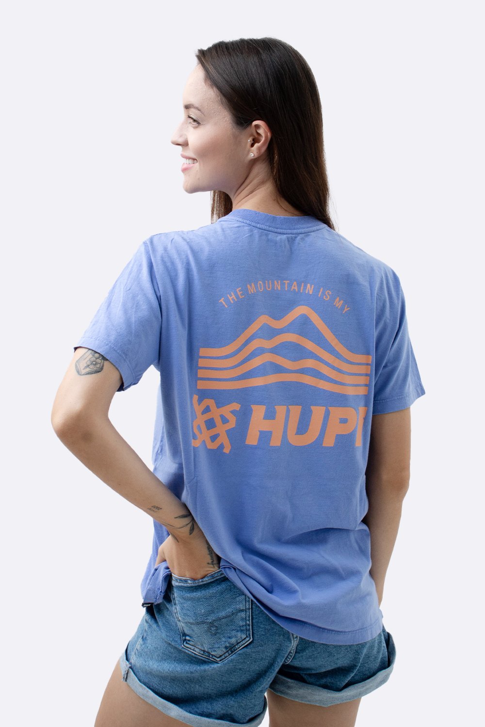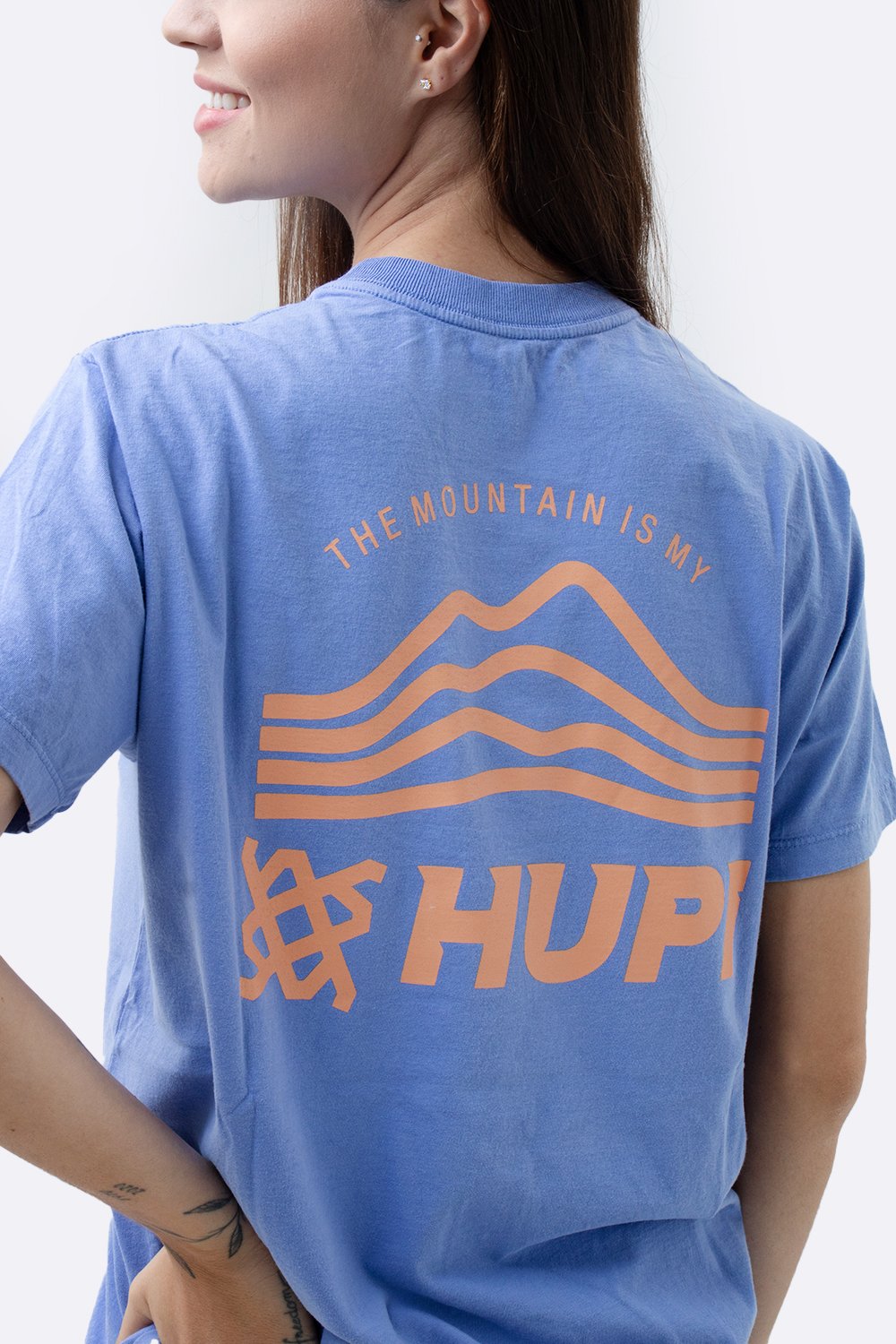 A estampa frontal exibe o logo HUPI acompanhado do ícone de montanhas, enquanto o destaque fica para a arte nas costas com a frase “THE MOUNTAIN IS MY” – um tributo à conexão com a natureza e aos desafios da altitude.