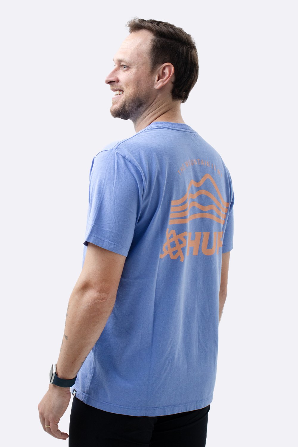 Estampa: Logo frontal HUPI com arte “THE MOUNTAIN IS MY” nas costas (silk à base d’água)