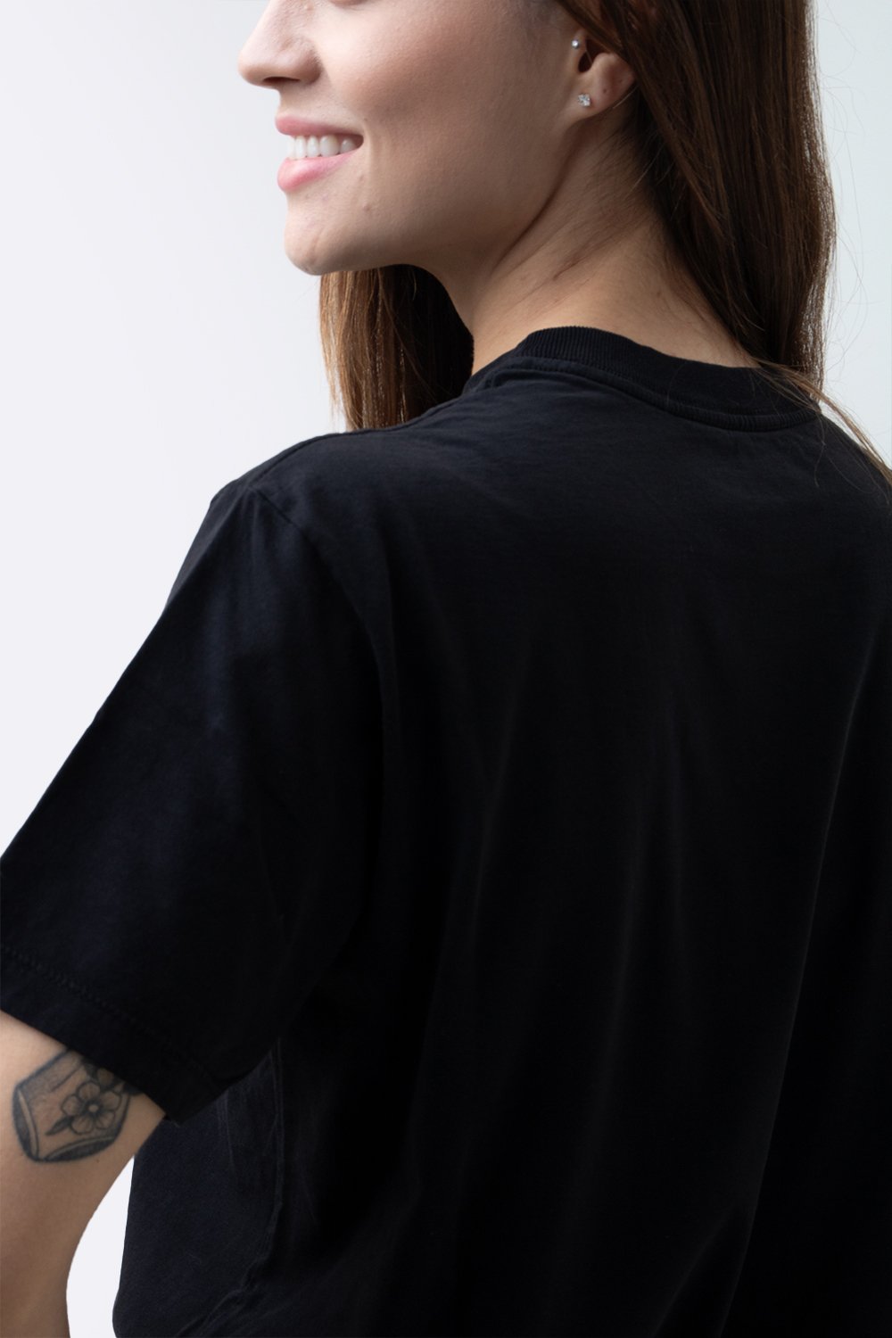 Com modelagem levemente quadrada e corte reto, a peça proporciona um caimento fluido, ideal para composições casuais e modernas.
