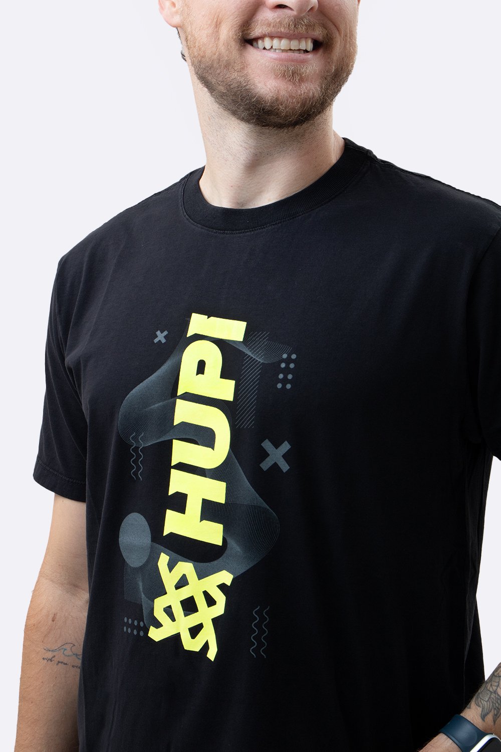 Estampa frontal: Arte “HUPI” em amarelo e cinza com elementos gráficos