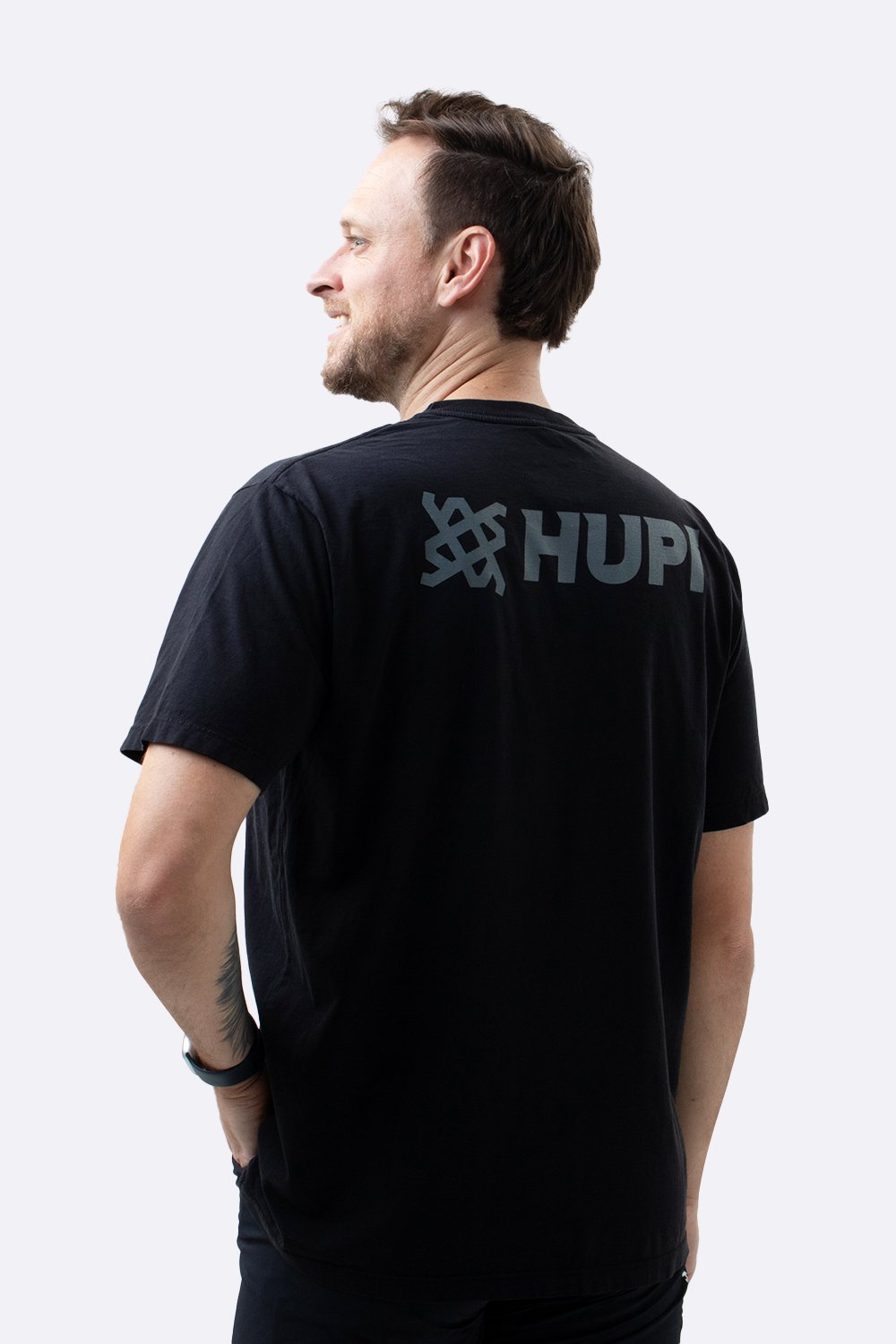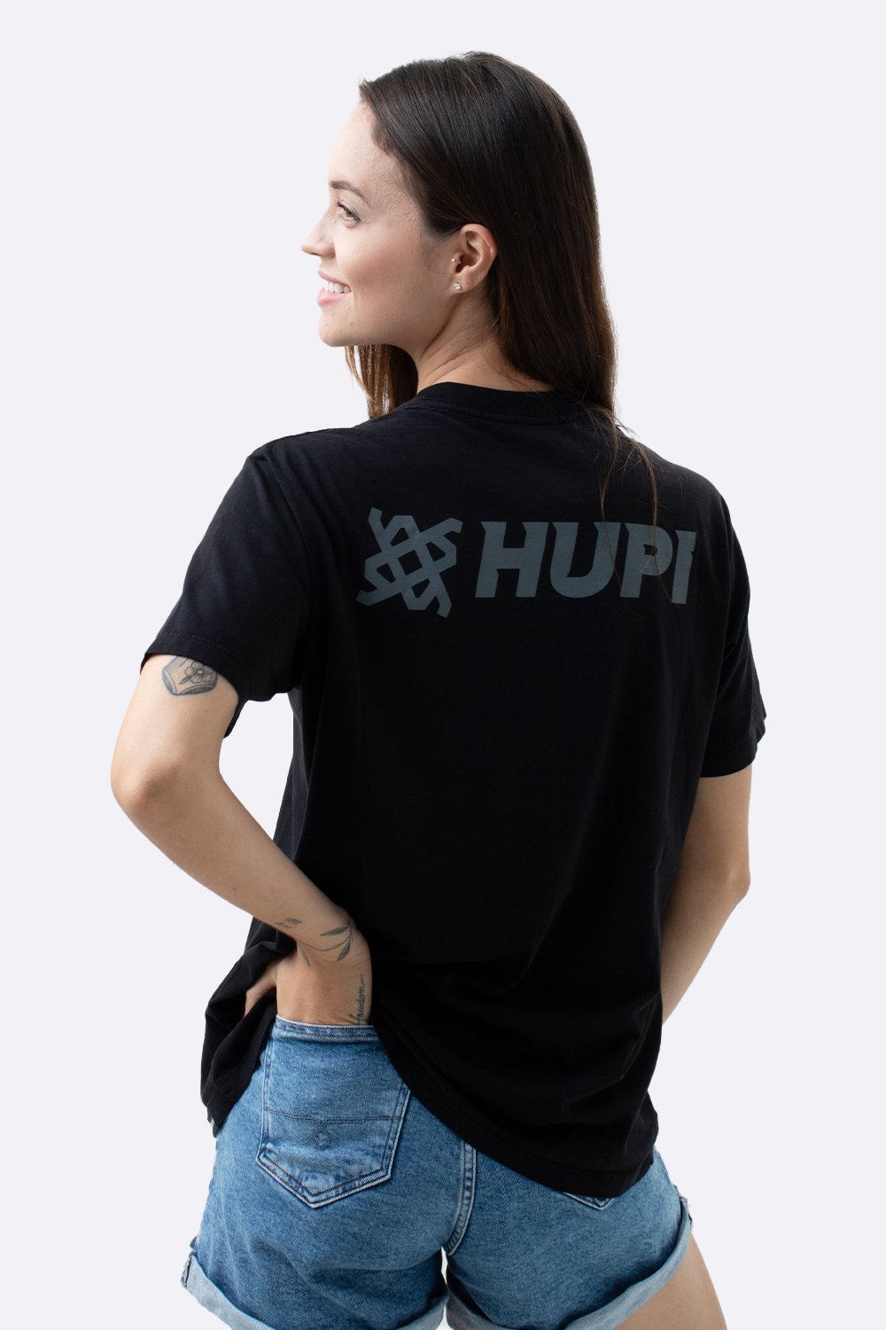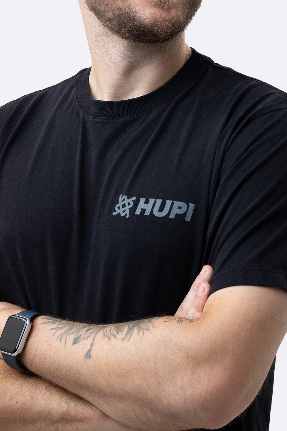 Na parte de trás, o nome HUPI aparece centralizado em tamanho maior, reforçando a presença da marca de forma limpa, direta e visualmente marcante.