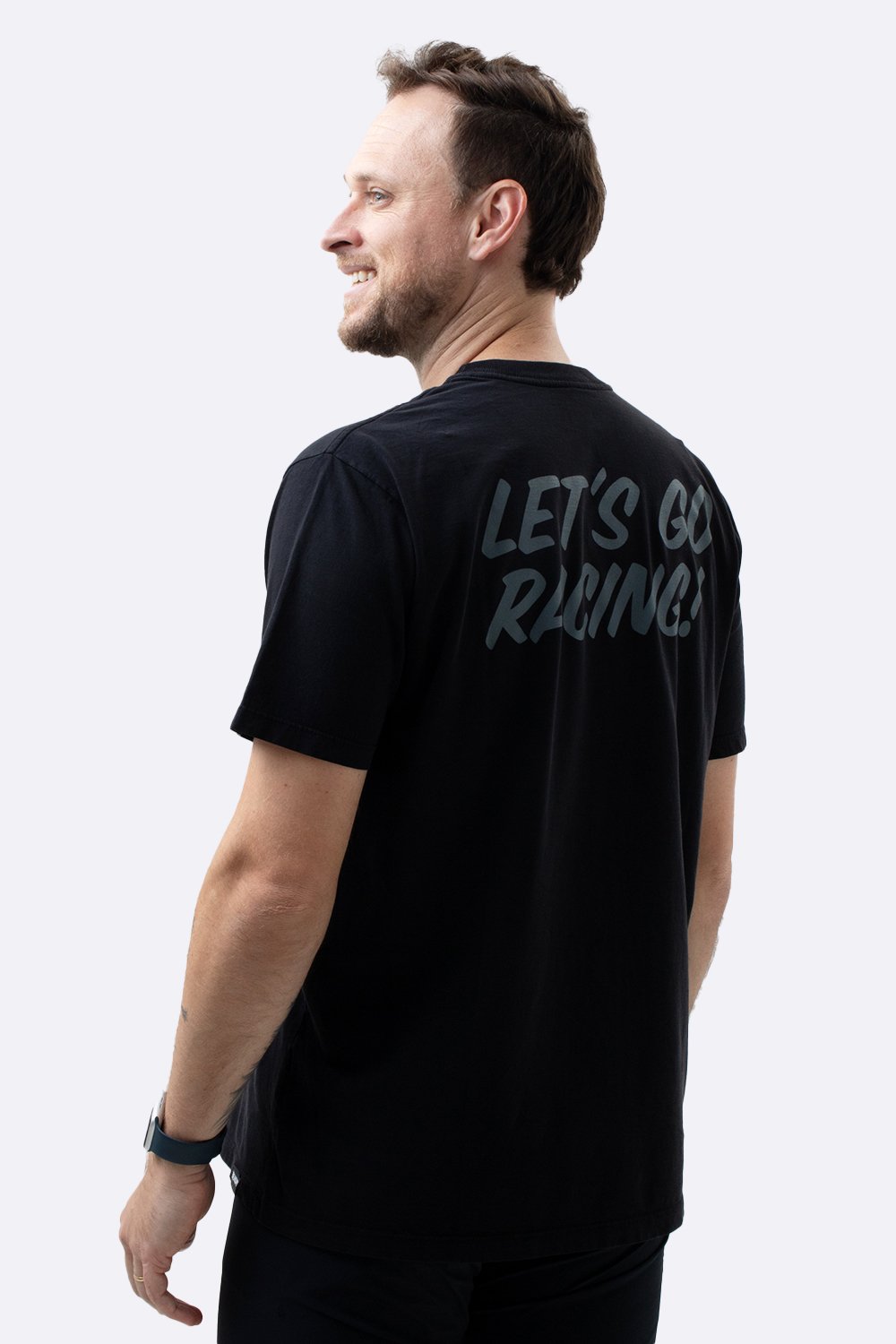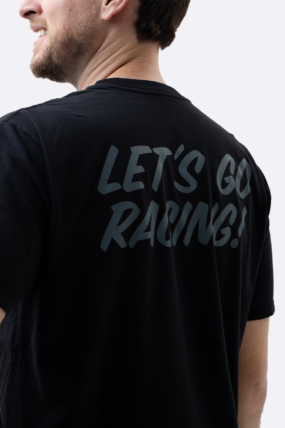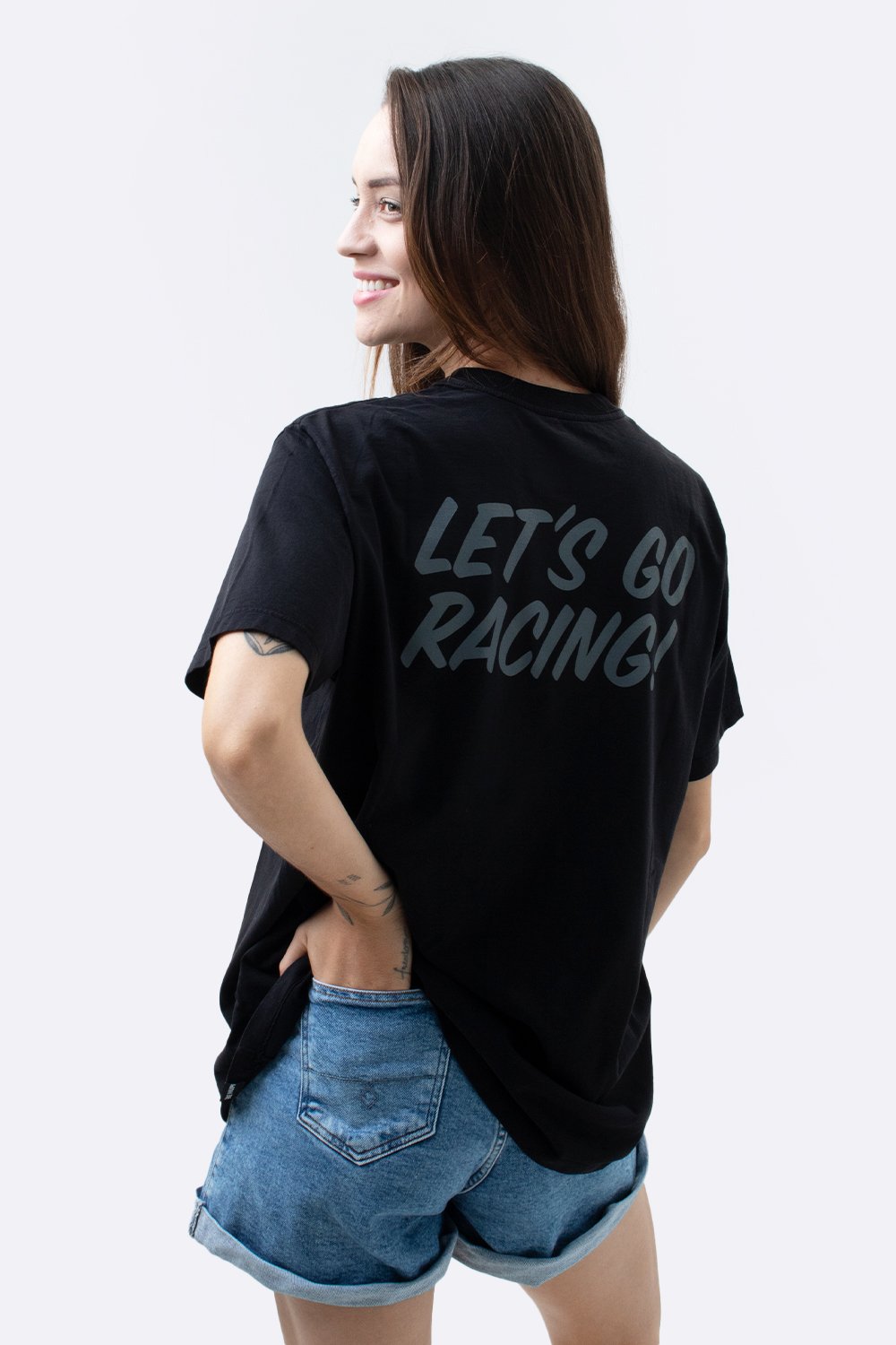 Estampa traseira: “LET’S GO RACING!” em letras grandes