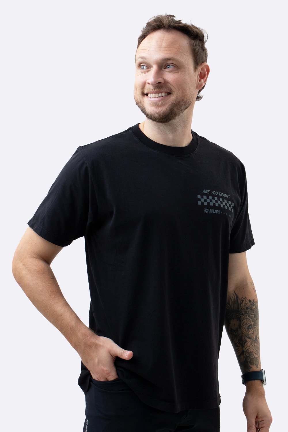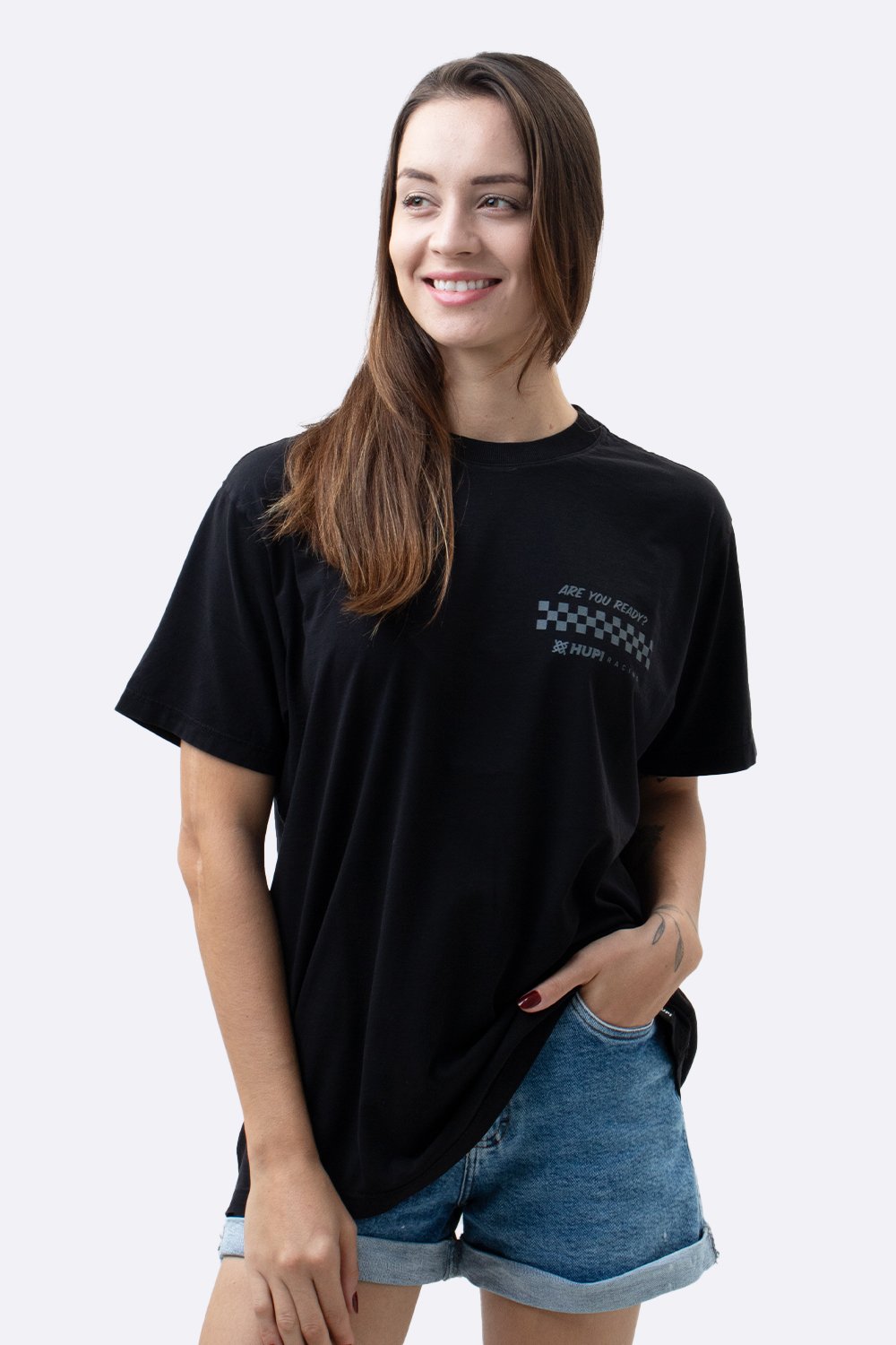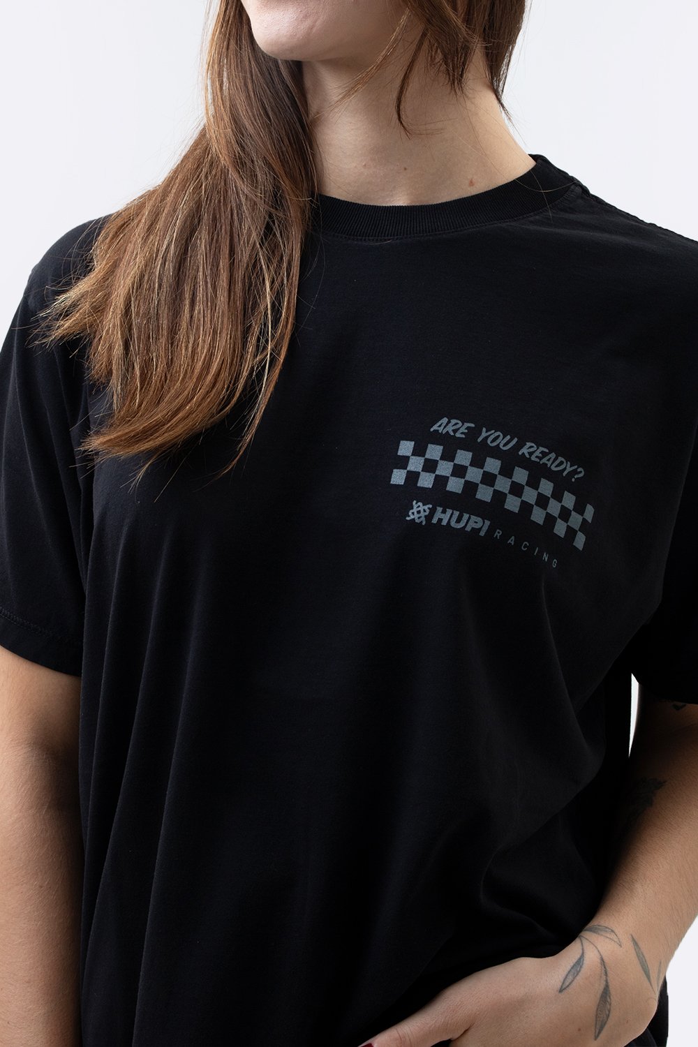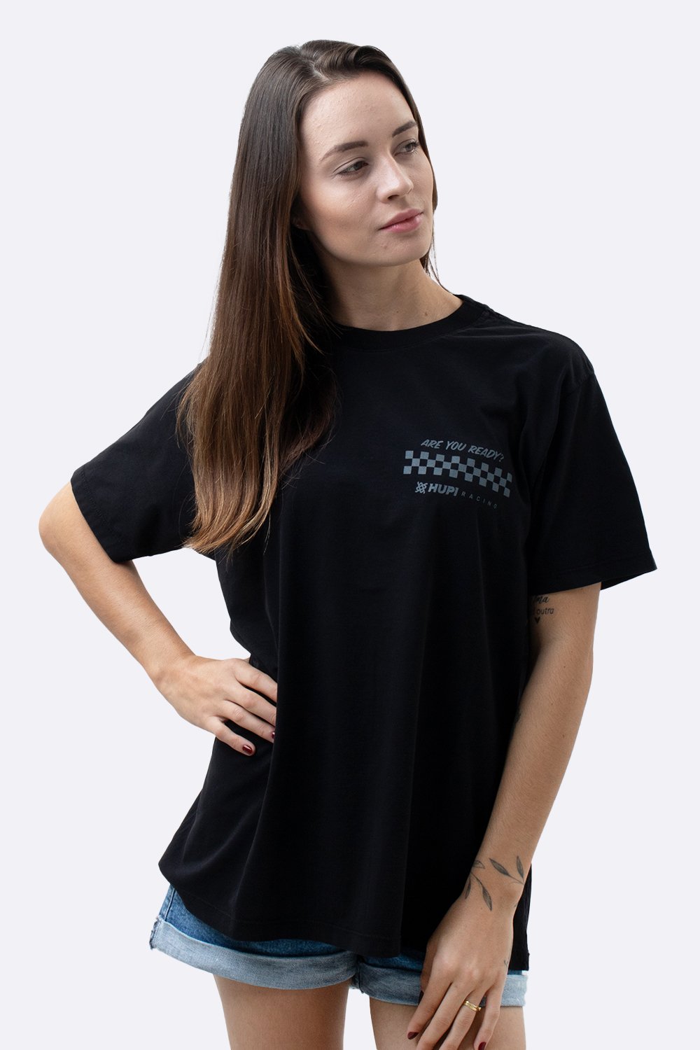 Estampa frontal: “ARE YOU READY?” + HUPI RACING com faixa xadrez