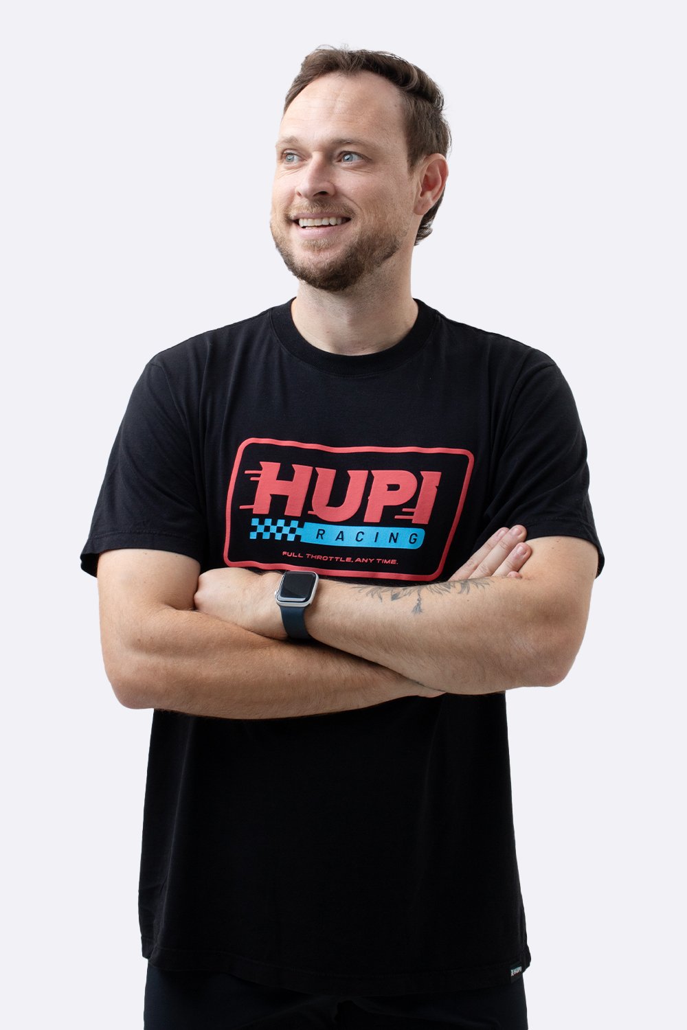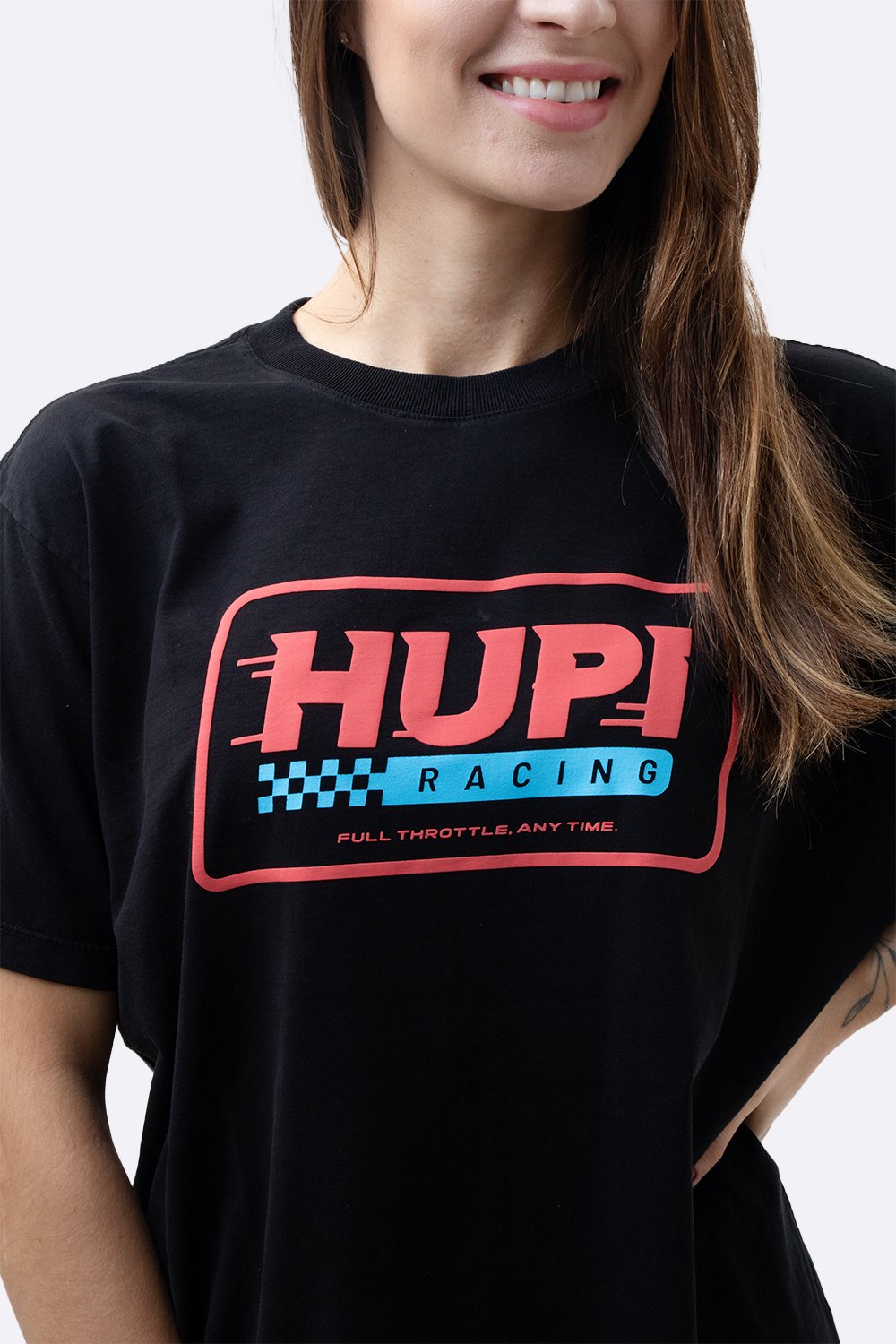 A estampa frontal apresenta o logo HUPI RACING em destaque, acompanhado da faixa quadriculada e da frase “FULL THROTTLE. ANY TIME.”, um reforço visual de que o ritmo não para.