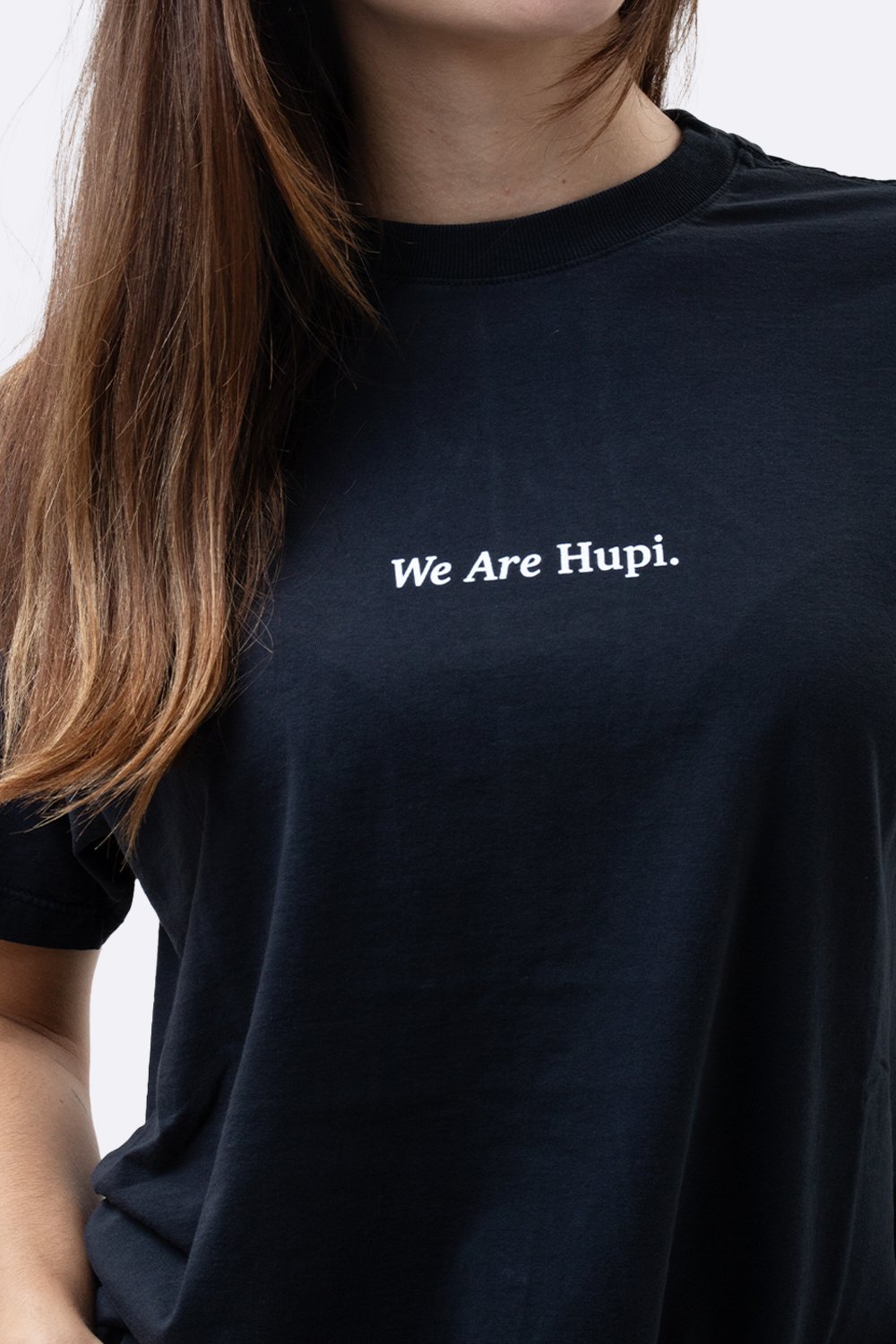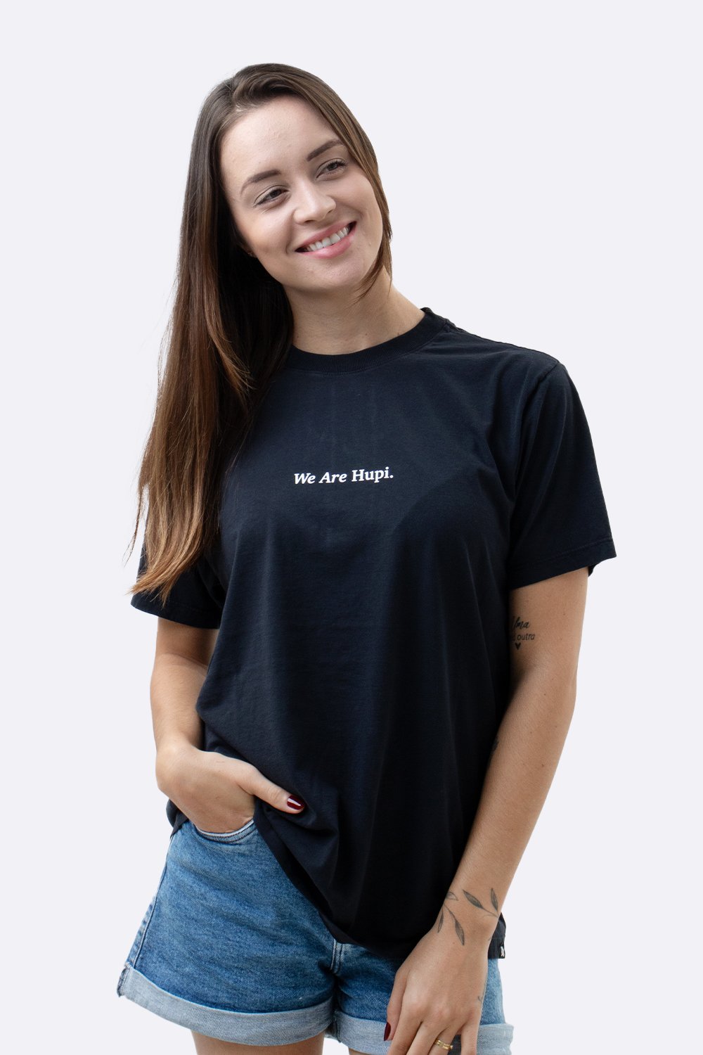 A estampa frontal centralizada traz a frase “We Are Hupi.” em silk branco.