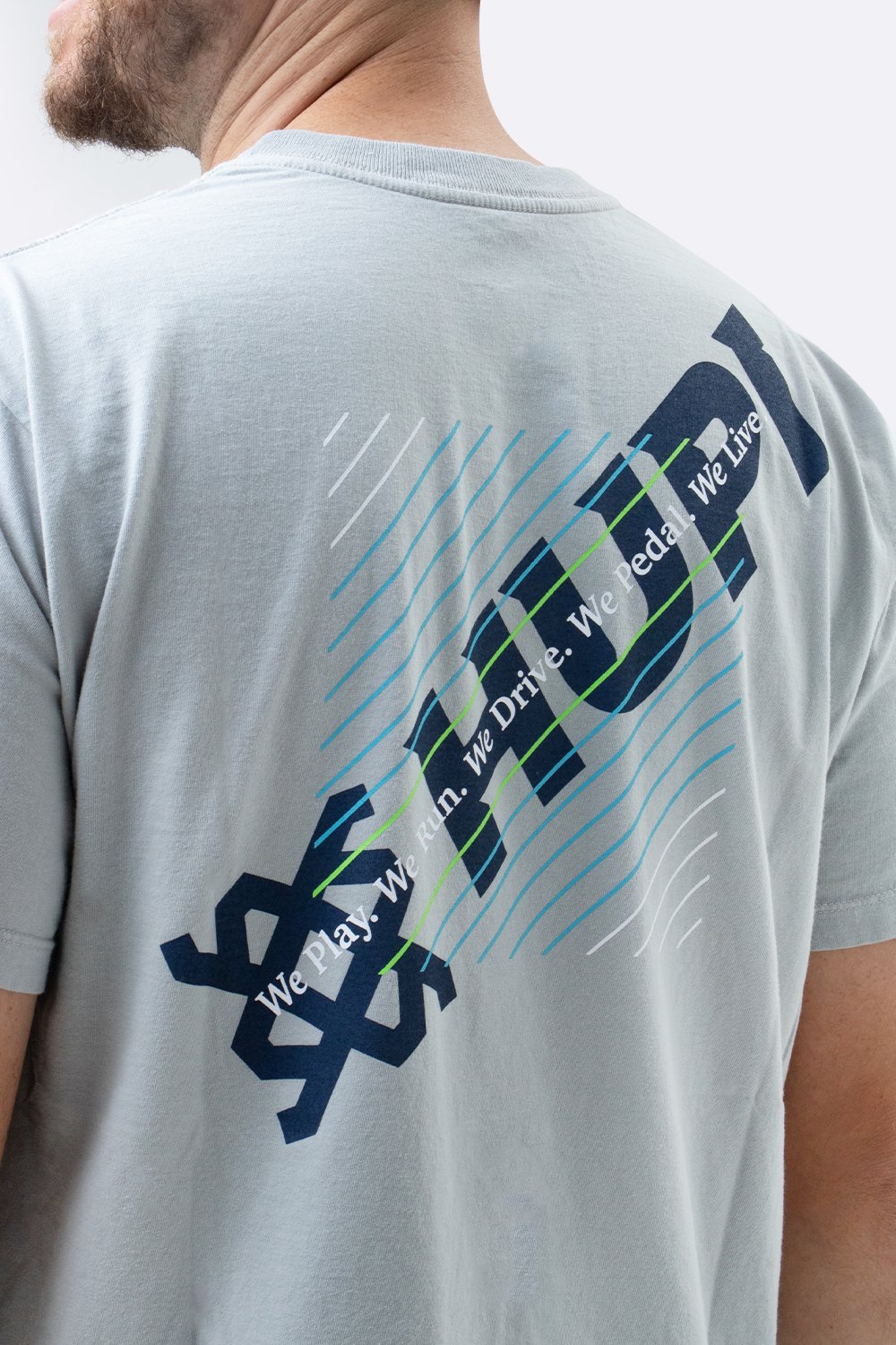 Estampa traseira: Logo HUPI com linhas diagonais e frase “We Play. We Run. We Drive. We Pedal. We Live.”
