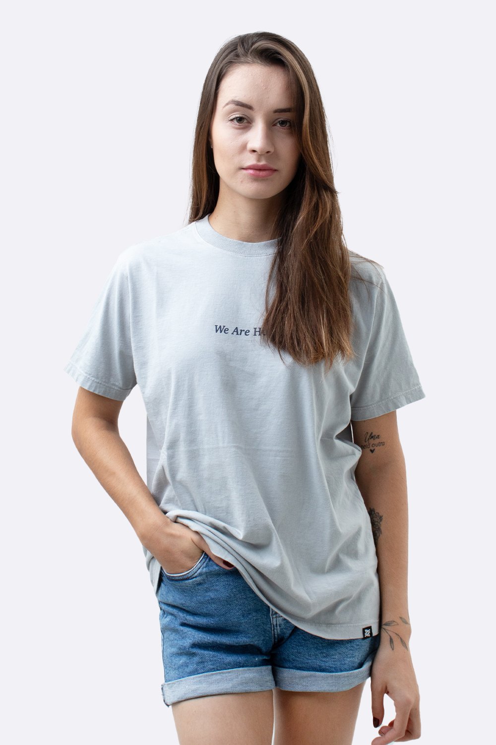 A estampa frontal centralizada traz a frase “We Are Hupi.” em silk azul escuro.