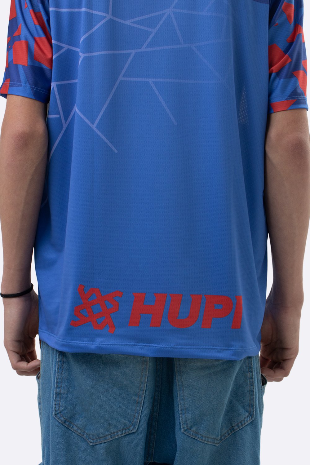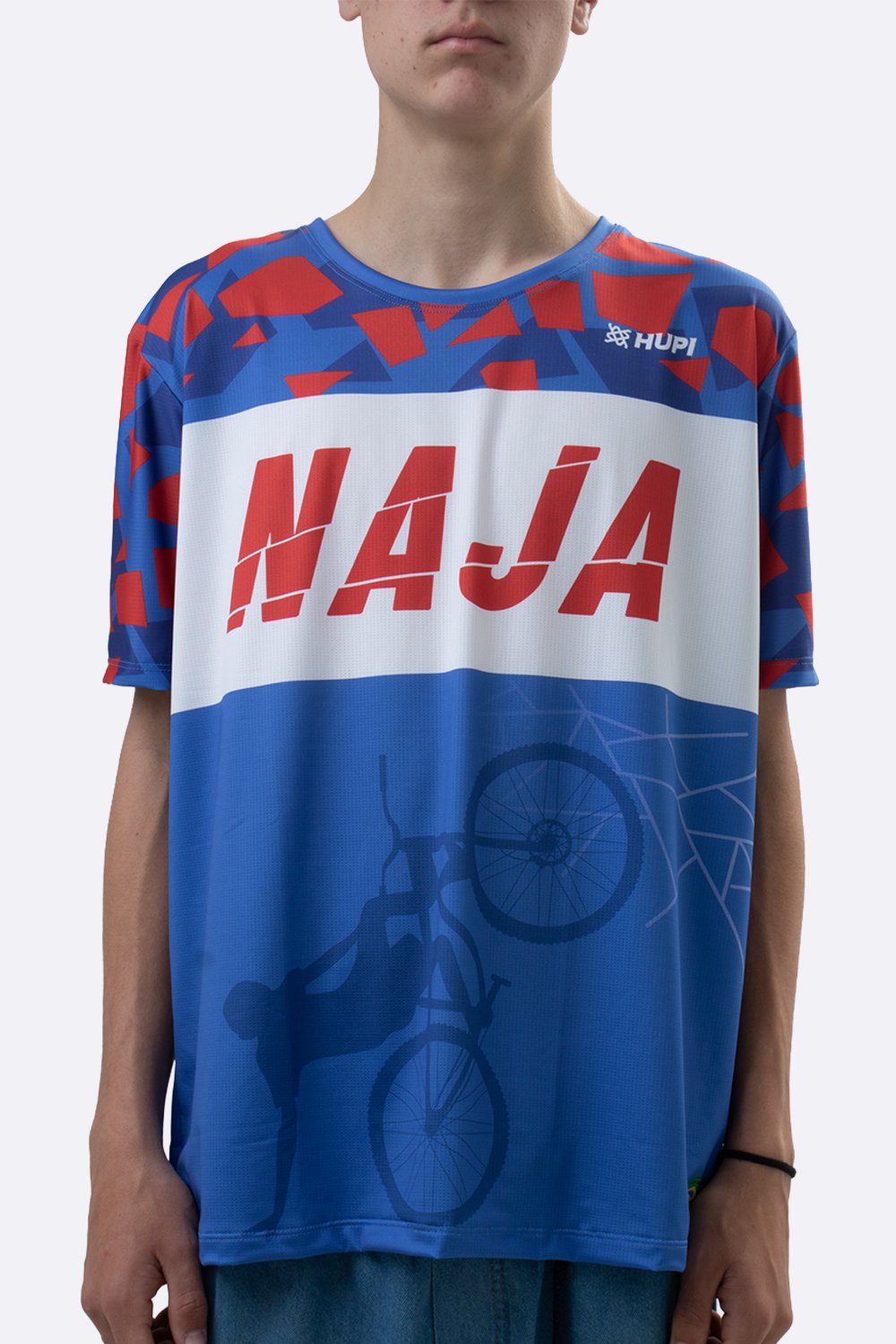 A Camiseta Masculina HUPI Bike Naja Azul/Vermelho é feita em tecido Dry Fit com microfuros estrategicamente distribuídos, que ajudam a manter o corpo arejado e seco, mesmo em dias quentes ou durante atividades mais ativas.