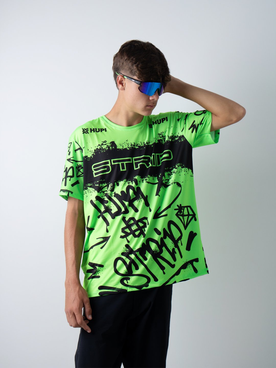 O verde vibrante combinado ao preto cria impacto visual imediato. O nome STRIP aparece em destaque, reforçando conexão direta com o universo da bike e transmitindo personalidade. Não é apenas uma camiseta casual. É uma peça com leitura visual estratégica, construída para quem gosta de movimento, estilo e presença.