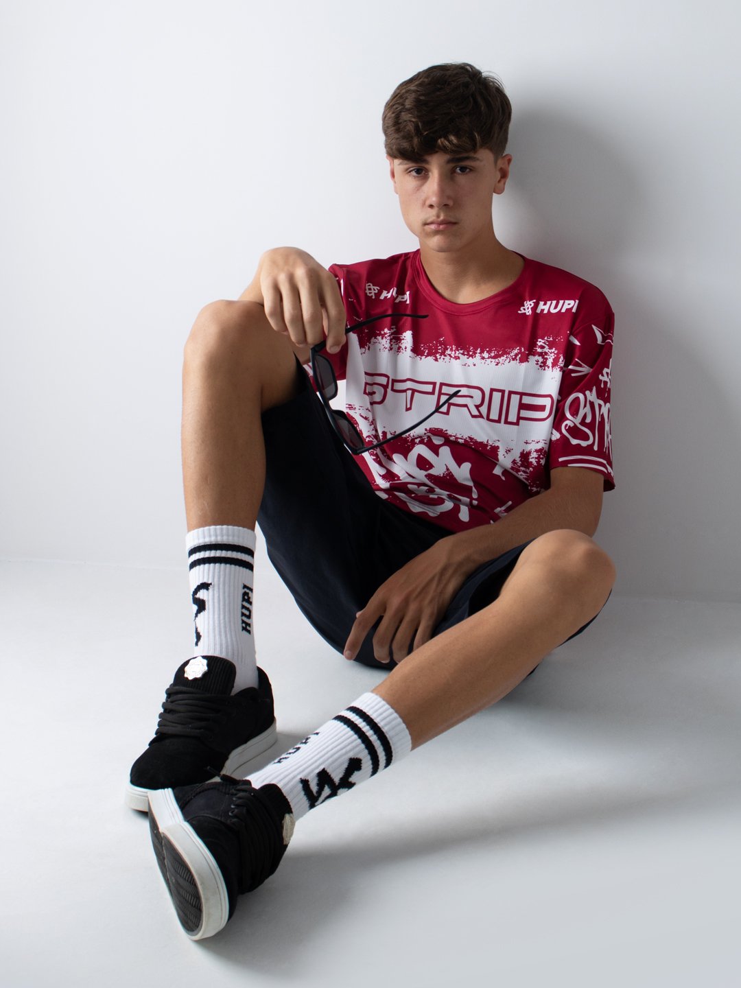 O vermelho vibrante combinado ao branco cria impacto visual imediato. O nome STRIP aparece em destaque, reforçando conexão direta com o universo da bike e transmitindo personalidade. Não é apenas uma camiseta casual. É uma peça com leitura visual estratégica, construída para quem gosta de movimento, estilo e presença.