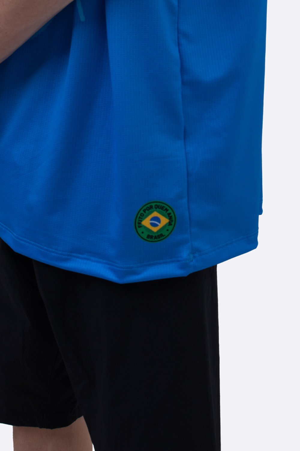 A camiseta é produzida com um tecido que mistura 96% poliéster e 4% elastano.