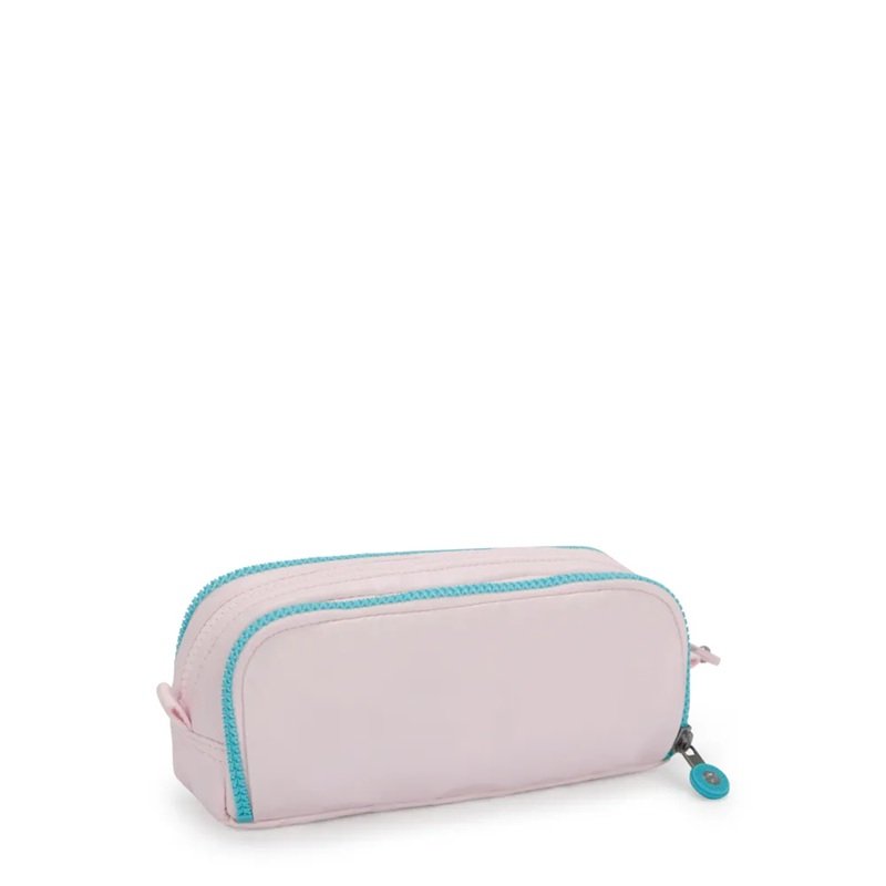 O Estojo Kipling Gitroy Rosa é confeccionado em poliamida resistente, um material leve, durável e fácil de limpar, ideal para o uso diário. Ele possui três compartimentos independentes, sendo dois deles equipados com elásticos internos que mantêm instrumentos de escrita firmes e visíveis. Já o compartimento central é mais amplo e acomoda itens maiores como borracha, apontador, tesoura, cola, régua pequena ou acessórios de arte.
