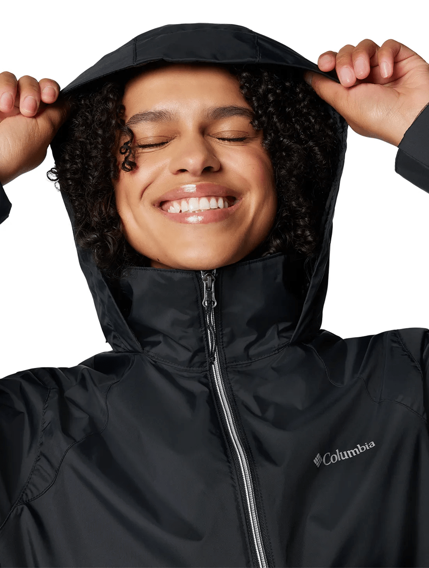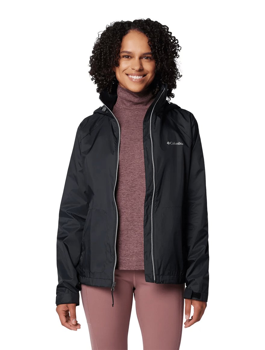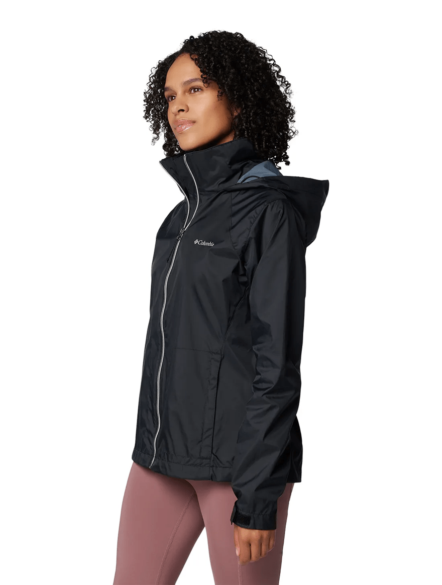 A Jaqueta Columbia Feminina Switchback IV Preta é a escolha perfeita para mulheres que buscam praticidade, leveza e proteção contra vento e chuva leve.