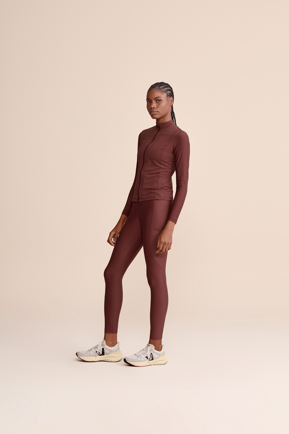 A superfície texturizada do tecido Harmony valoriza o visual esportivo e ao mesmo tempo favorece a respirabilidade, ideal para práticas de alta intensidade.