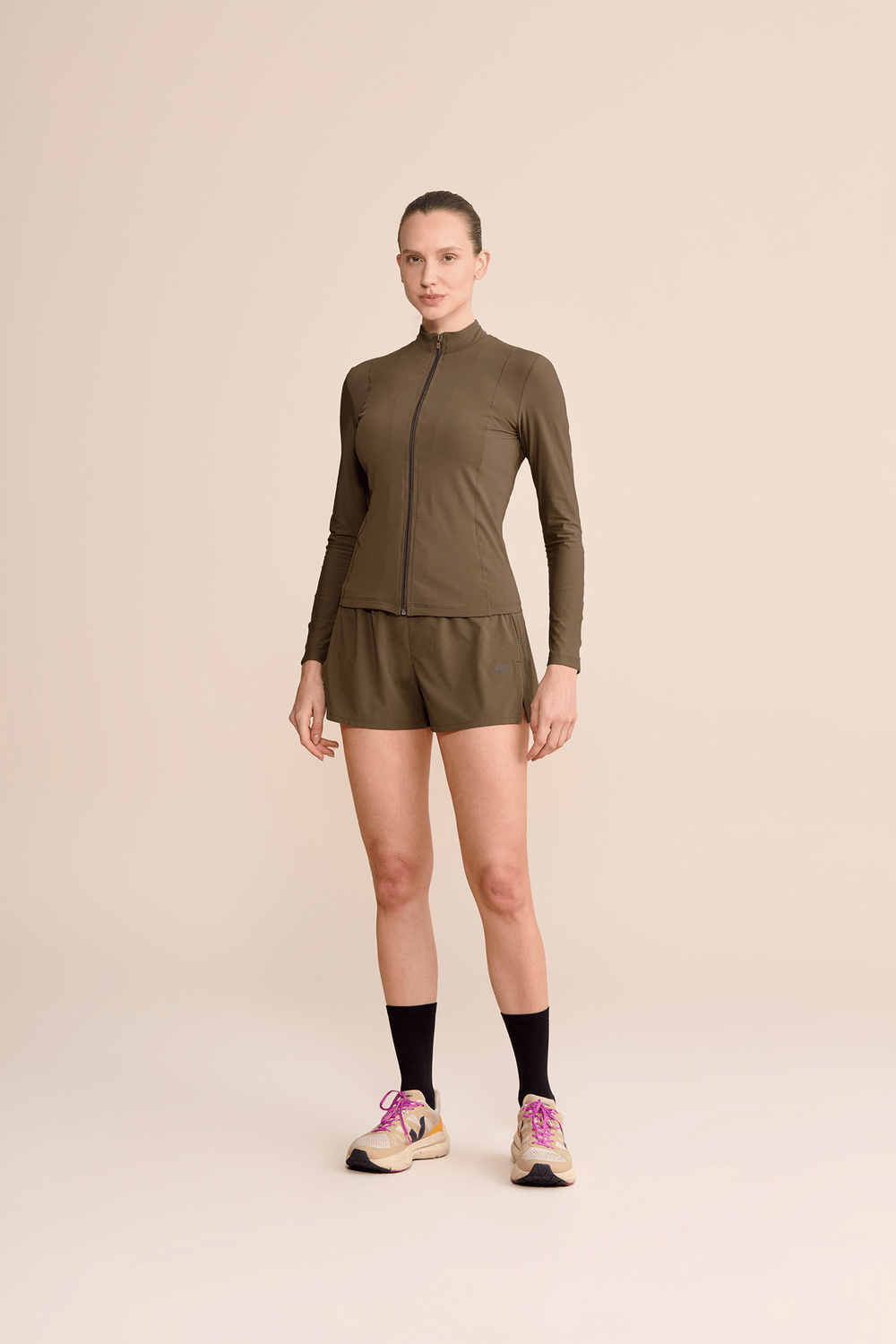 Seu design anatômico com modelagem ajustada proporciona liberdade de movimento e ótimo caimento no corpo, enquanto a gola alta e o fechamento com zíper garantem mais proteção e praticidade durante a prática esportiva.