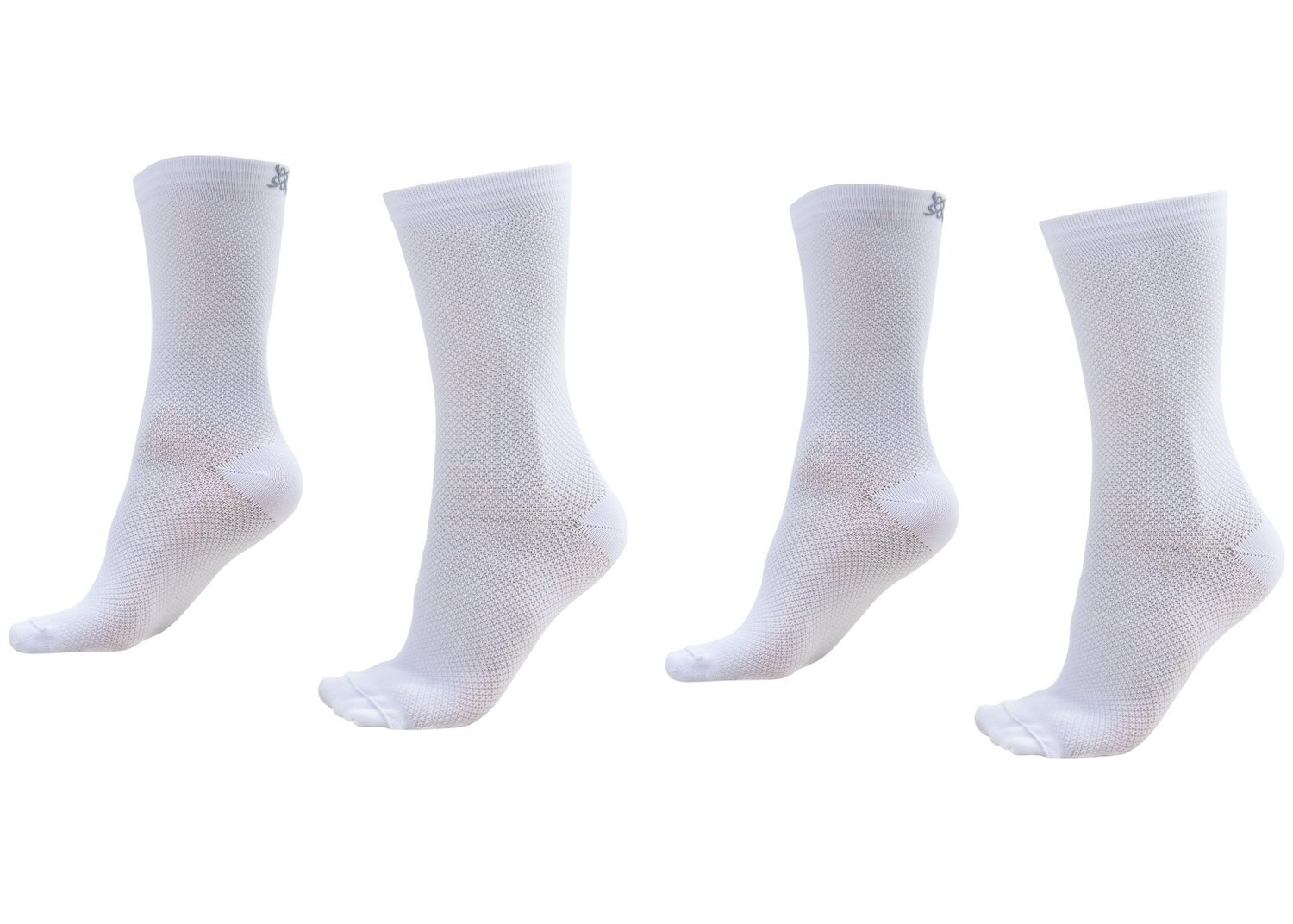Os fios de elastano e poliamida formam um conjunto cheio de vantagens. O principal destaque é o conforto, proporcionado pela transpiração que a meia oferece, deixando os pés secos e bem protegidos. A combinação da matéria prima assegura a flexibilidade oferecendo maior liberdade de movimento, sem que a peça laceie, perdendo sustentação. Na região dos dedos e calcanhar, os fios são dispostos em direções diferentes do restante da meia, fazendo com que a modelagem se torne muito mais anatômica, acompanhando o desenho dos pés. Esta característica também prolonga a durabilidade, impedindo o desgaste.