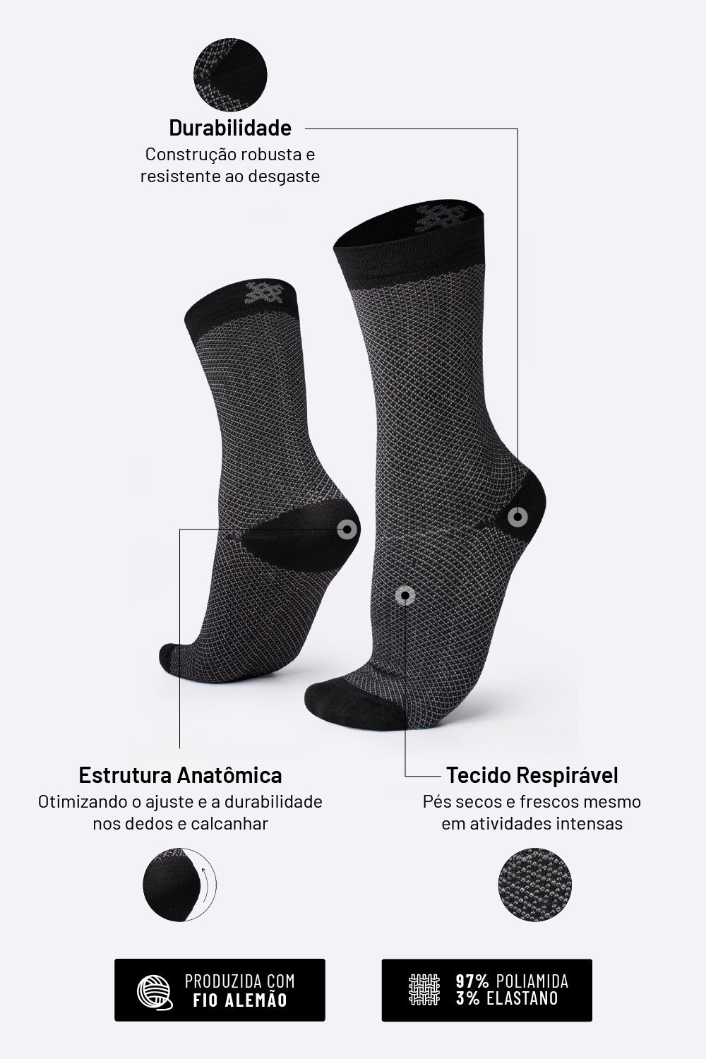 O principal destaque é o conforto, proporcionado pela transpiração que a meia oferece, deixando os pés secos e bem protegidos.