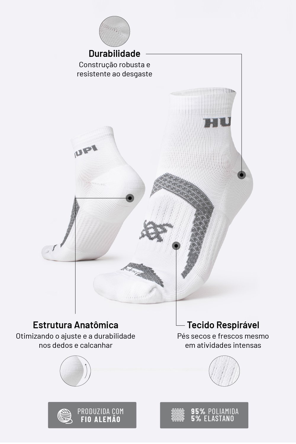 Na HUPI, cada detalhe importa. Por isso, nossas meias esportivas para corrida foram desenvolvidas com poliamida de alta qualidade e estrutura pensada para evitar bolhas, calos e desconfortos durante seus treinos e provas.