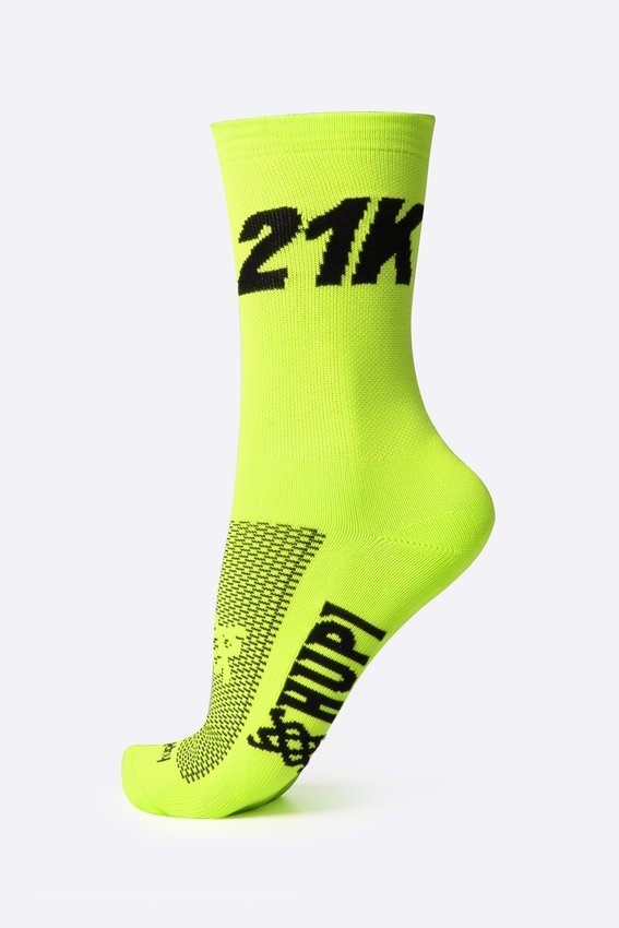 - Para quem encara desafios maiores, a meia 21K é a escolha certa! Com uma altura média e um design vibrante em neon, ela oferece suporte extra para percorrer longas distâncias.