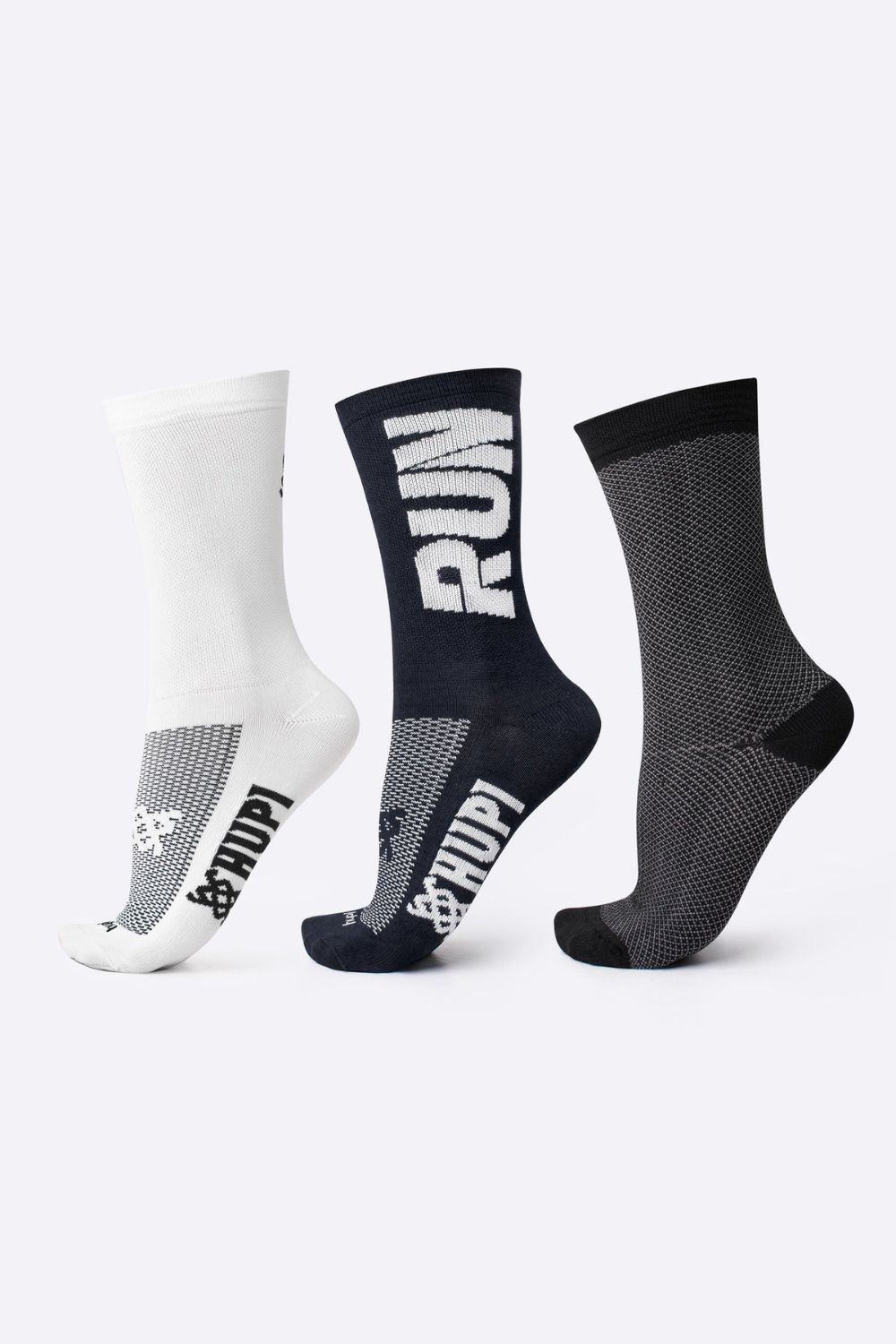 Treine com tecnologia, estilo e proteção com o Kit HUPI 3 Meias Cano Médio Preto e Branco. Mais conforto, mais confiança, mais performance em cada passo.