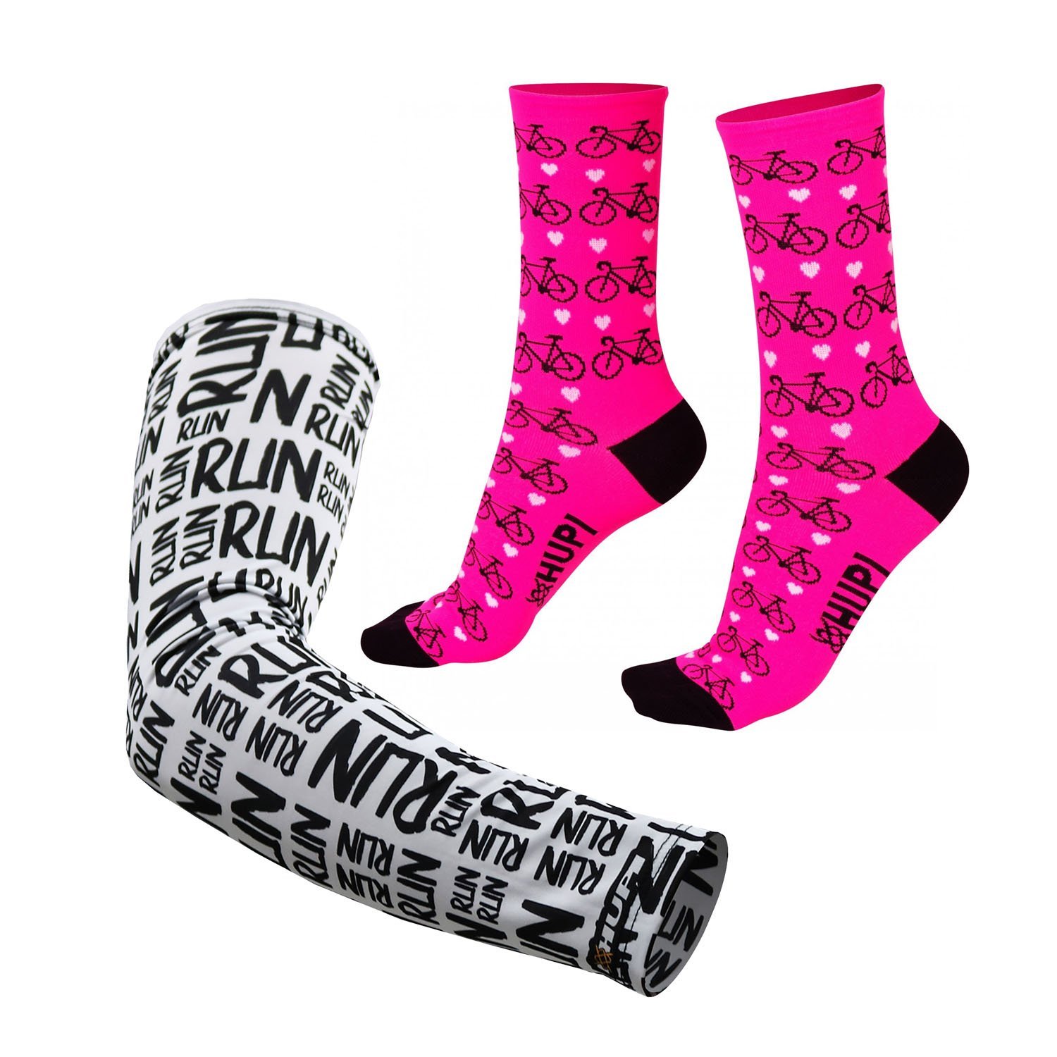 Kit Manguito HUPI Run Branco e Meia HUPI Rosa Love Bike