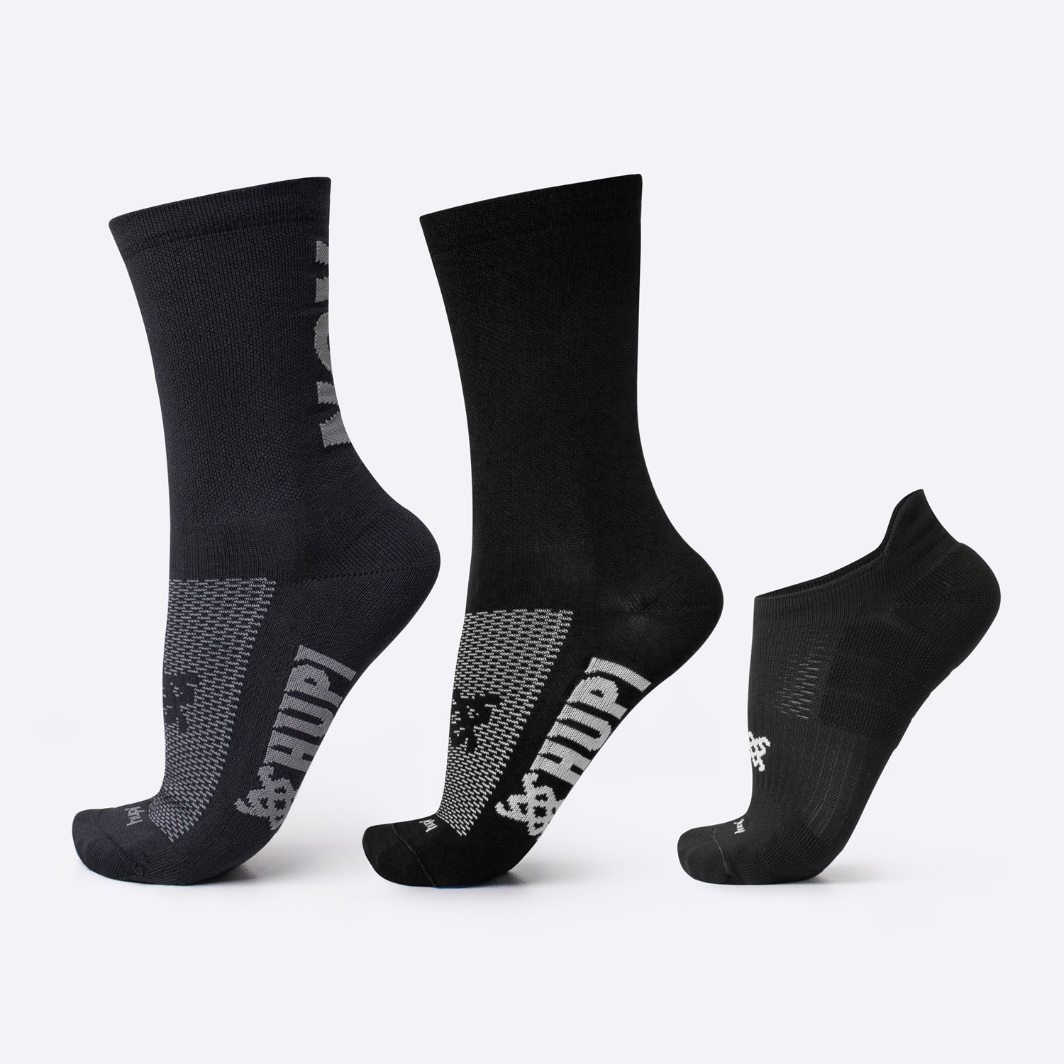 O kit inclui a Meia HUPI Run Preto e Cinza, a Meia HUPI Lisa Preta e a Meia HUPI Running Pro Invisível Preta.