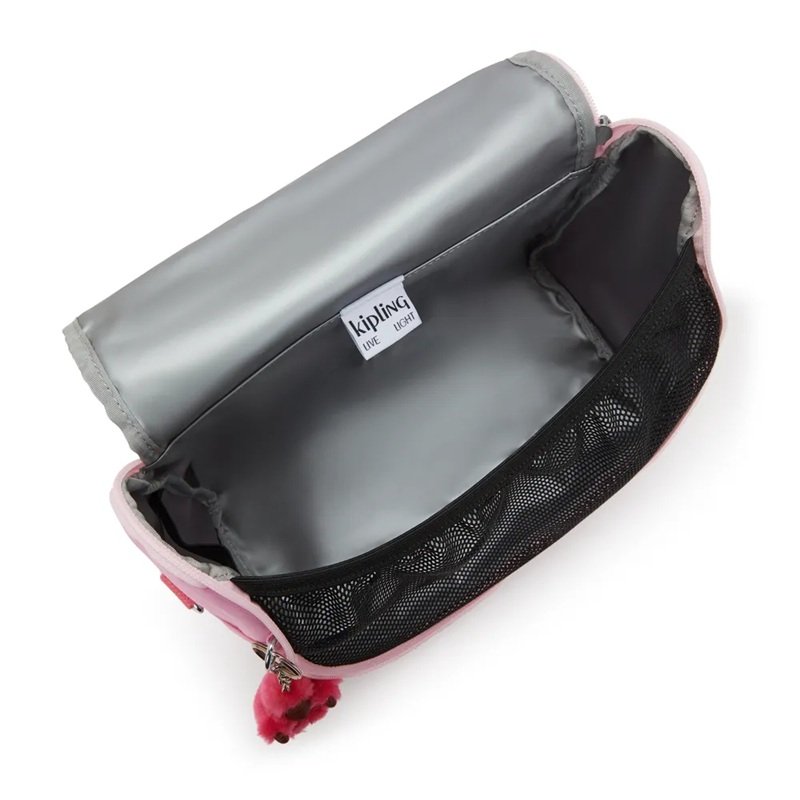 A Lancheira Kipling New Kichirou Rosa possui compartimento principal com isolamento térmico, ajudando a manter a temperatura dos alimentos por mais tempo, seja para itens frios ou levemente aquecidos. O interior facilita a organização de potes, frutas, sanduíches e bebidas.