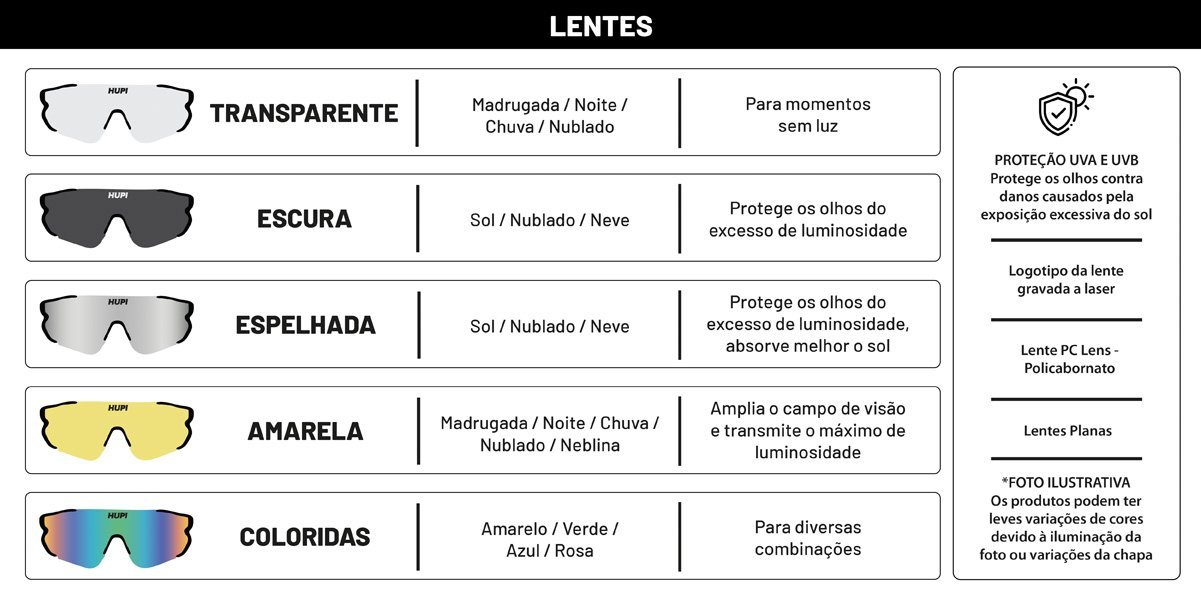 As lentes para os óculos HUPI são projetadas para proporcionar um desempenho aprimorado durante atividades como pedalar ou correr. Além de oferecerem proteção contra os raios UVA e UVB 400, possuem algumas características específicas. Aqui estão os detalhes: