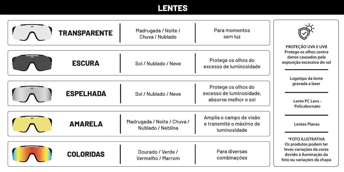 A seguir, temos um exemplo das cores de lentes disponíveis e as condições climáticas para ajudá-lo a fazer a compra correta da sua lente: