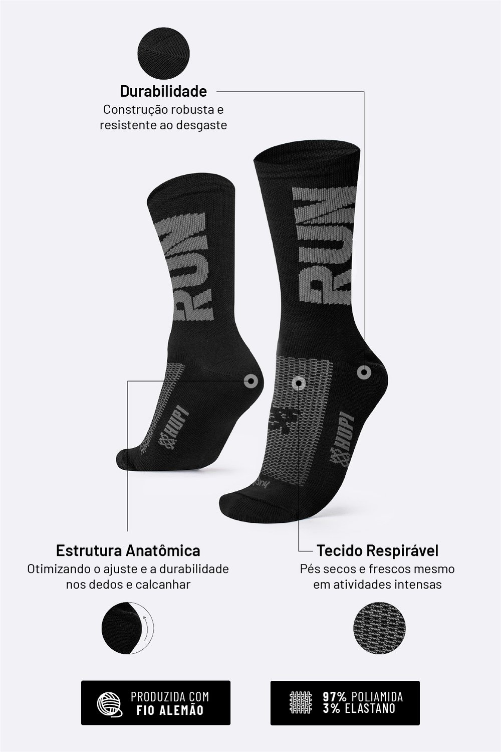 A Meia Corrida HUPI Run Preto/Cinza foi desenvolvida para corredores que não abrem mão de conforto, leveza e alta performance.