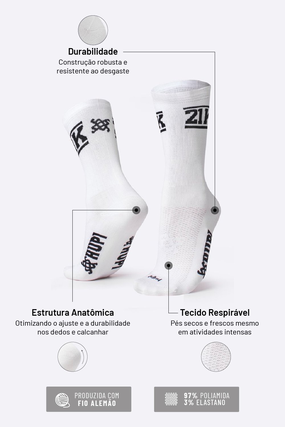Praticar esportes com conforto e máximo desempenho é o seu objetivo, e também o nosso. Por isso a meia HUPI apresenta diversos destaques que fazem dela um item fundamental.