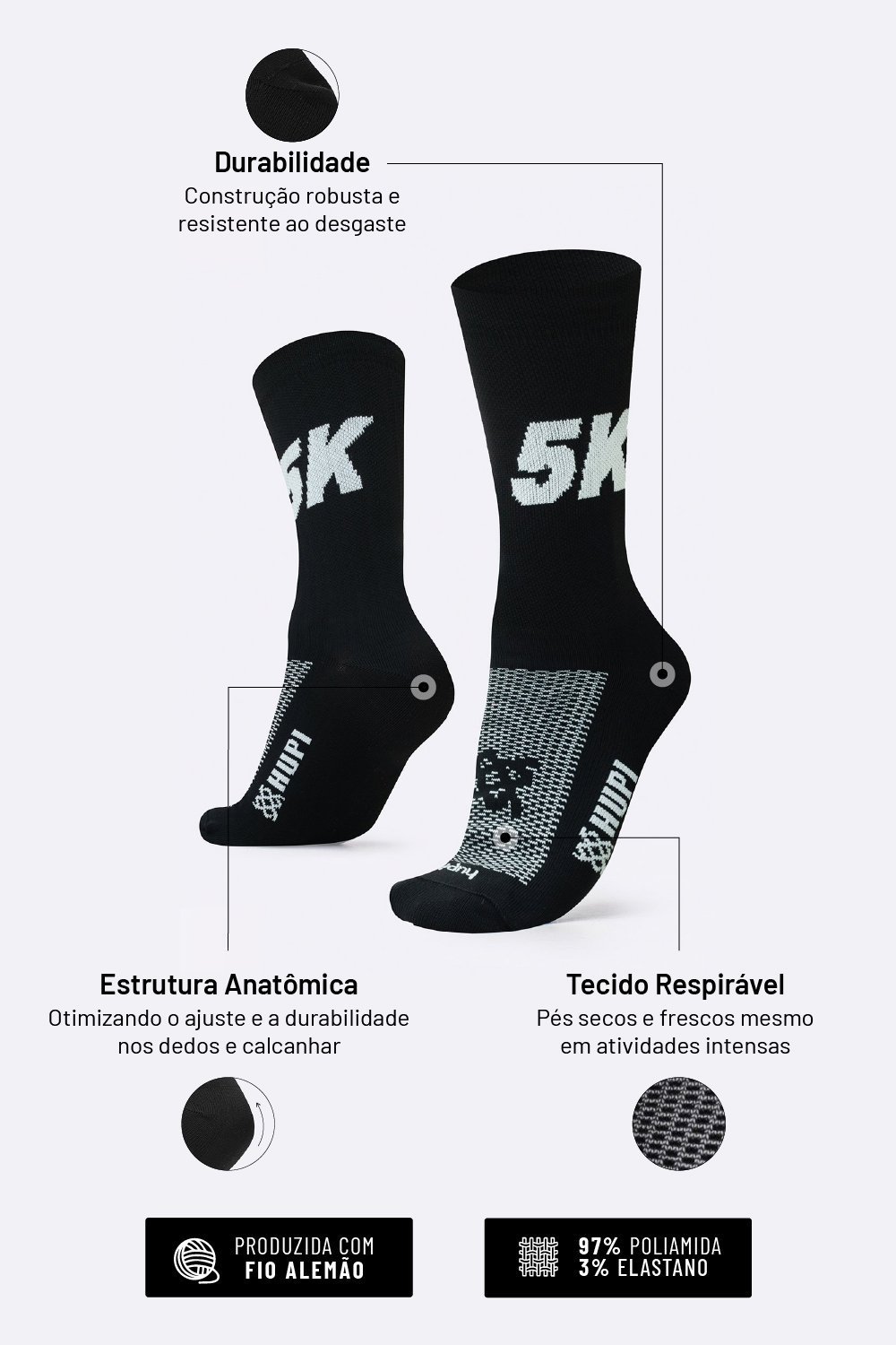 Na HUPI, cada detalhe importa. Por isso, nossas meias esportivas para corrida foram desenvolvidas com poliamida de alta qualidade e estrutura pensada para evitar bolhas, calos e desconfortos durante seus treinos e provas.