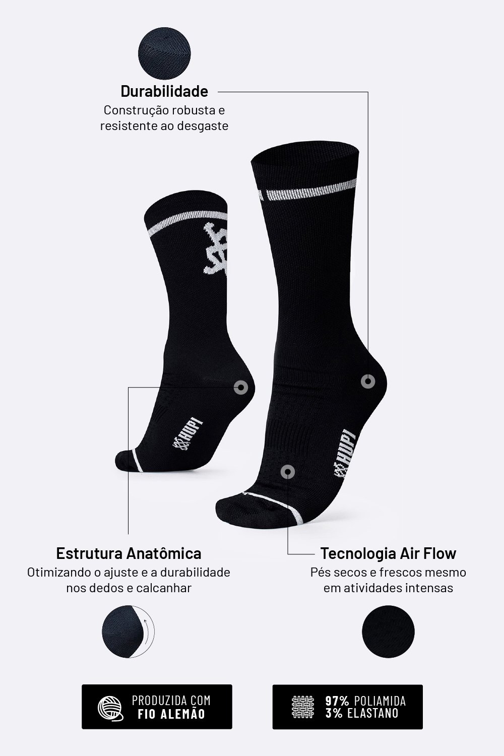 Na HUPI, cada detalhe importa. Por isso, nossas meias esportivas para corrida foram desenvolvidas com poliamida de alta qualidade e estrutura pensada para evitar bolhas, calos e desconfortos durante seus treinos e provas.
