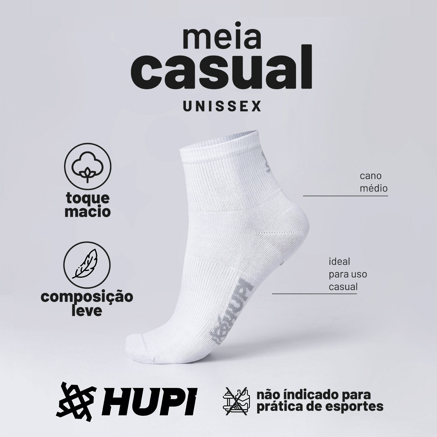 Meia HUPI para o dia a dia, toque macio e confortável, possui ótimo custo benefício. Composição leve e respirável, ideal para uso cotidiano.
