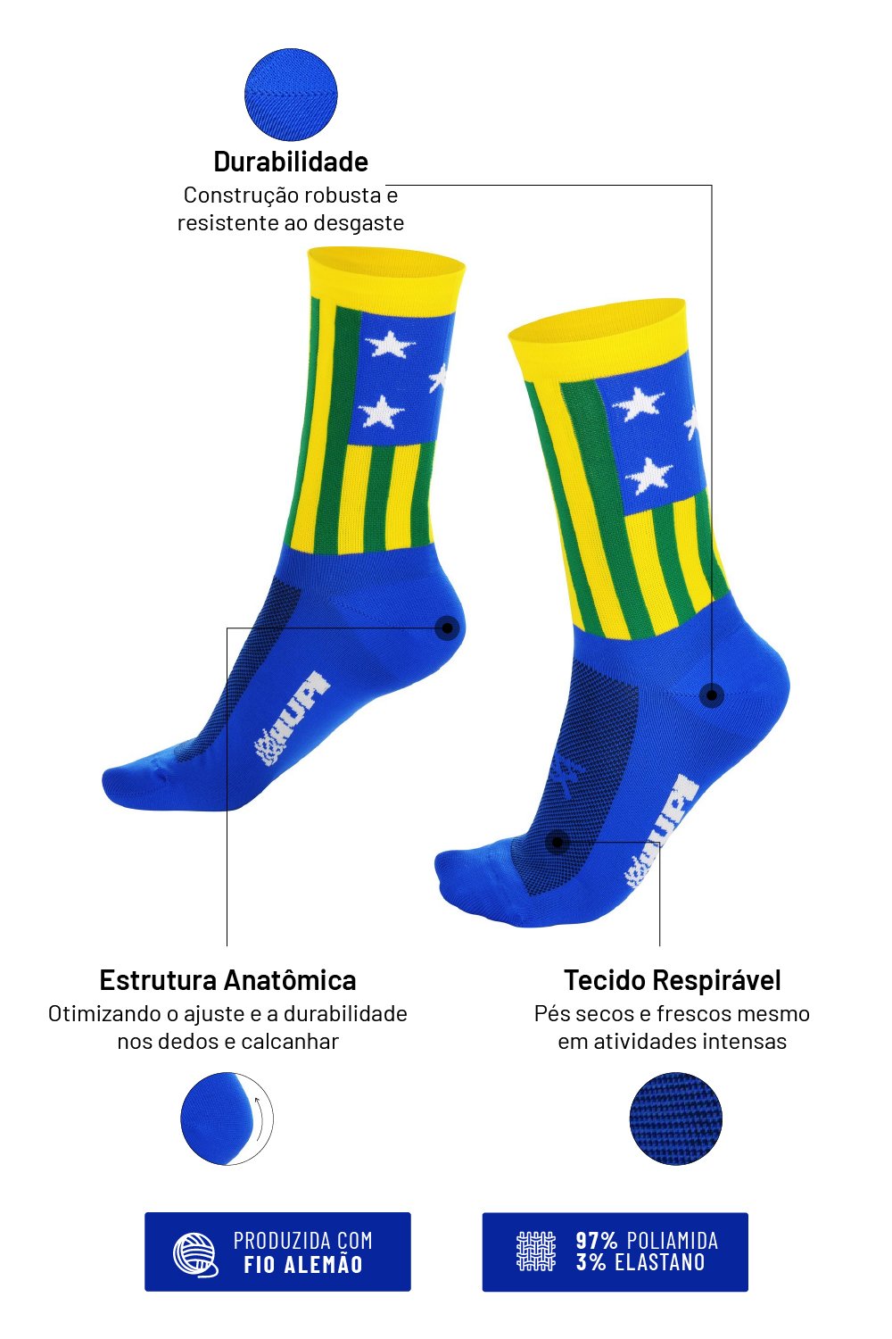 O principal destaque é o conforto, proporcionado pela transpiração que a meia oferece, deixando os pés secos e bem protegidos.
