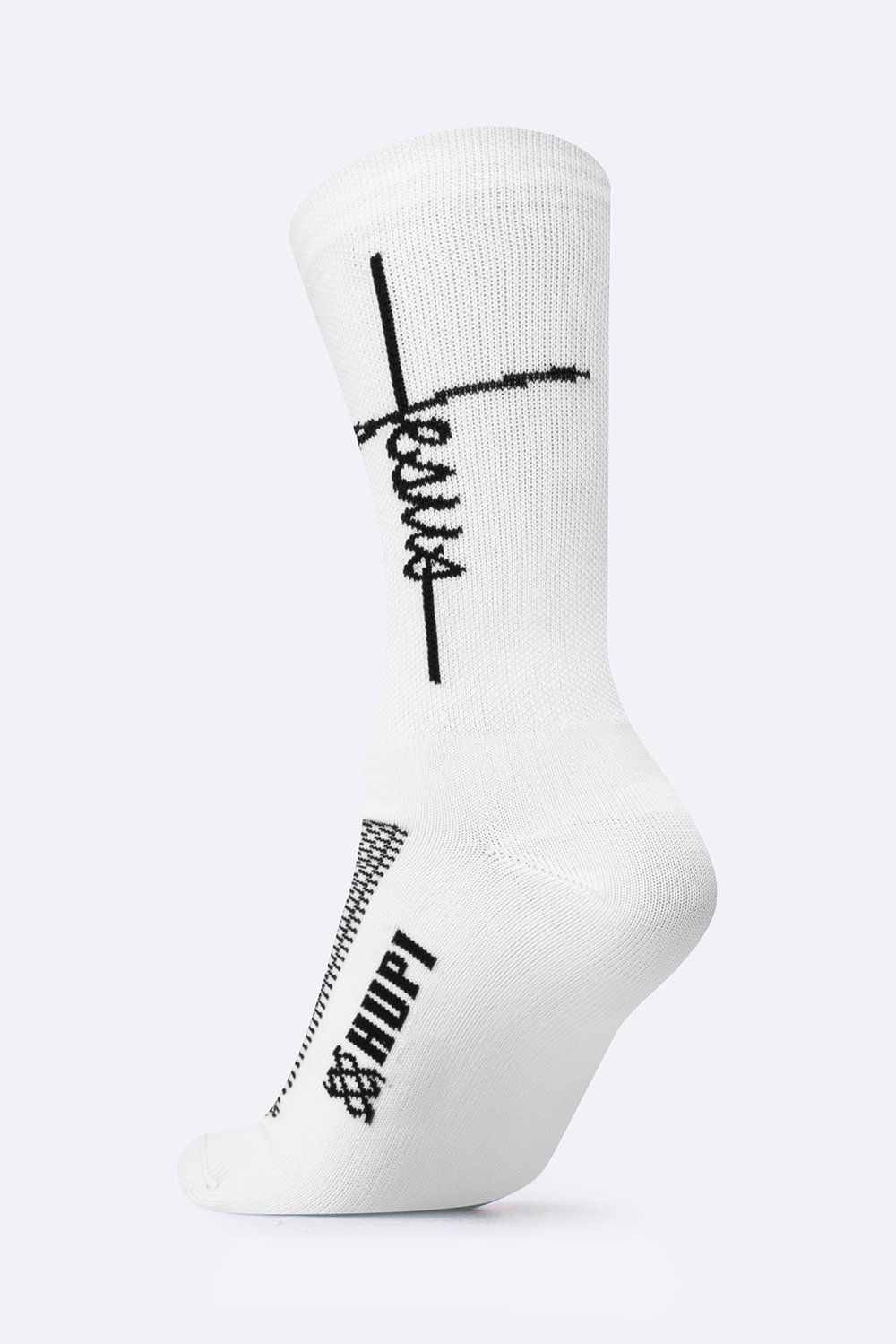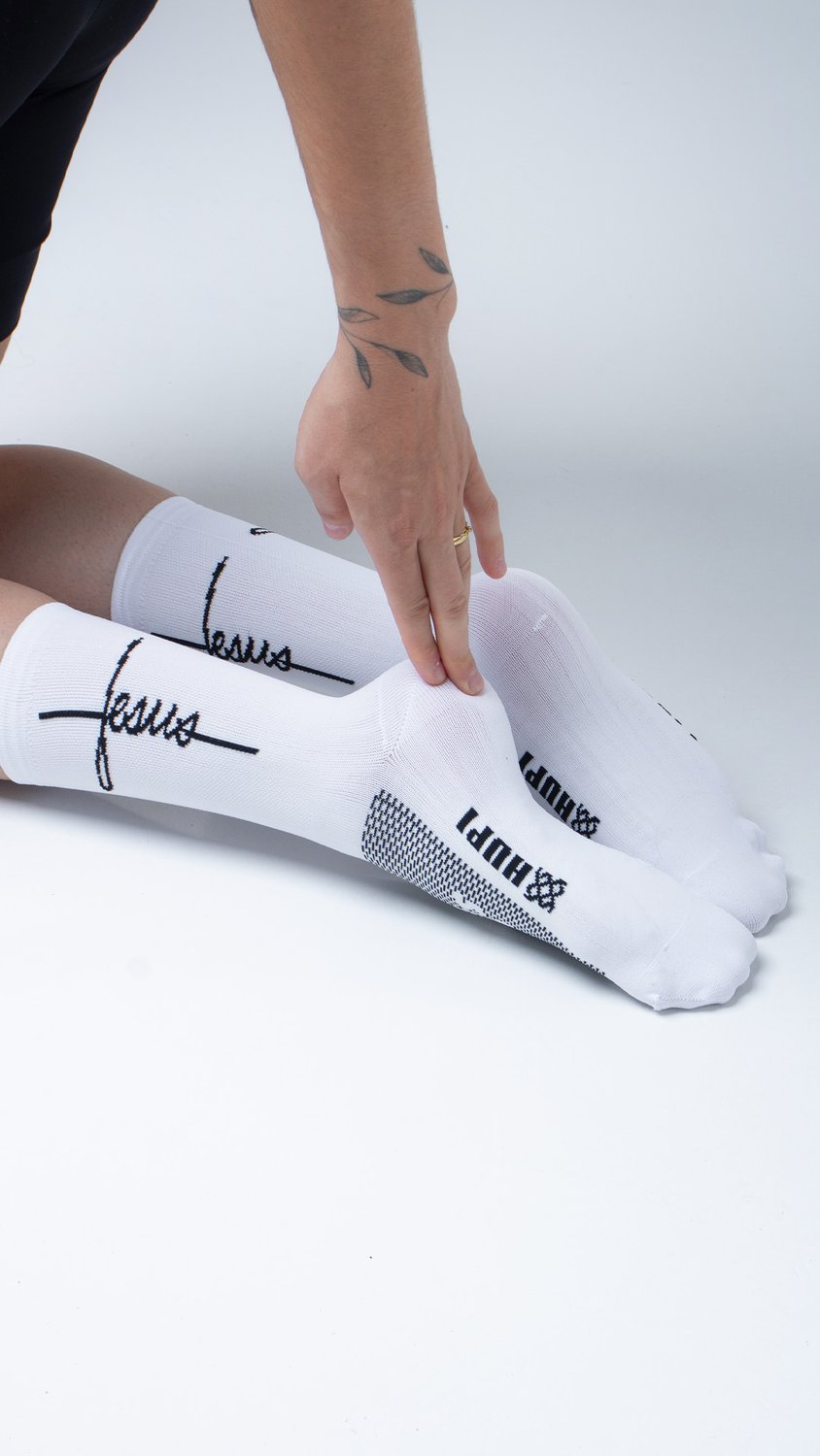 A Meia HUPI Jesus Branco Preto foi desenvolvida para oferecer máximo conforto, respirabilidade e durabilidade, sendo ideal para treinos esportivos, corridas, pedaladas e até para o uso casual.