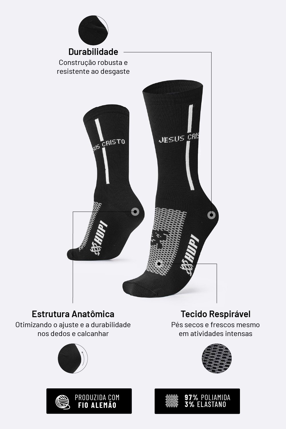 A Meia HUPI Jesus Cristo Preto Branco LT para Pés Menores 34-38 une tecnologia, conforto e resistência, sendo a escolha perfeita para quem busca desempenho superior e um ajuste perfeito.