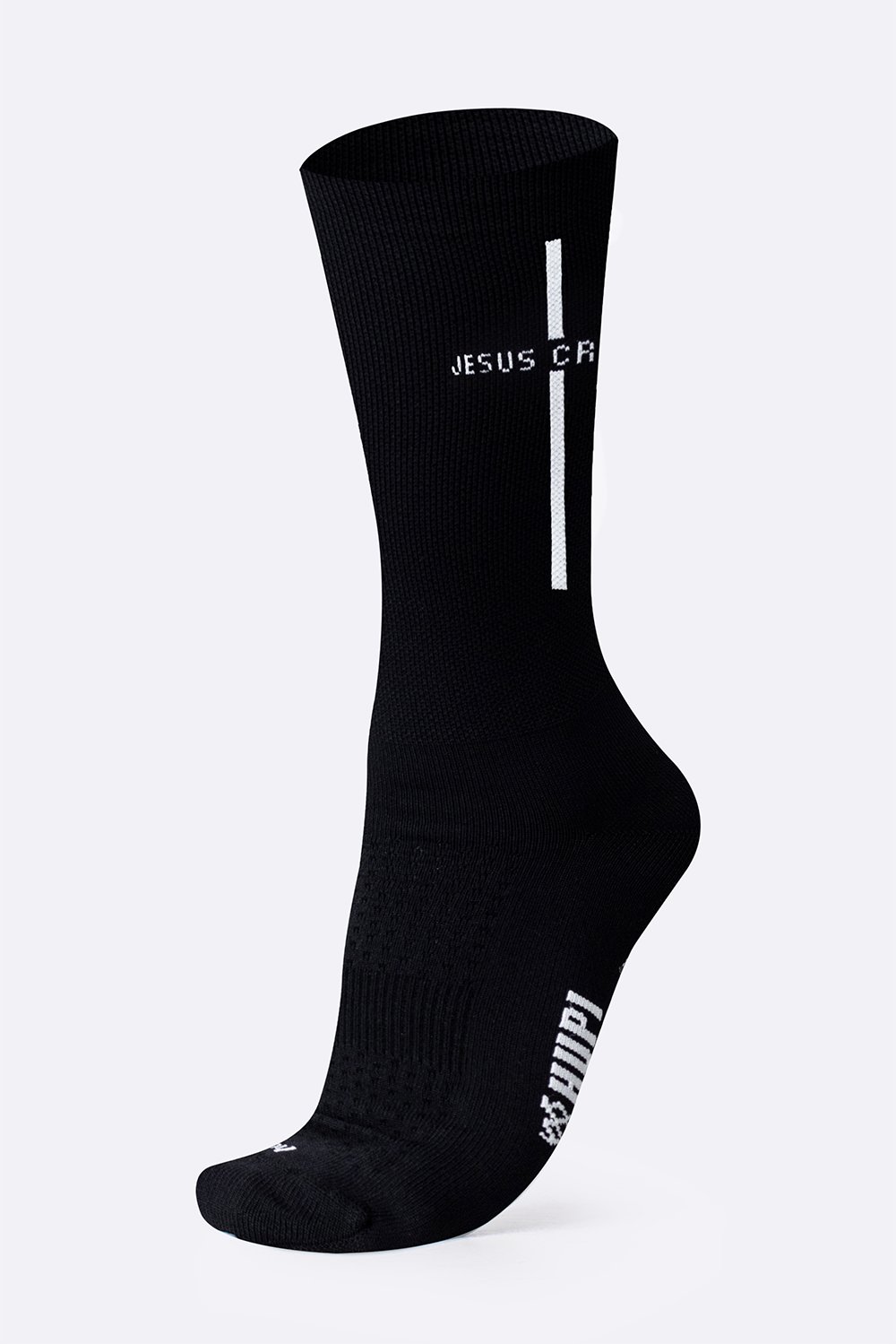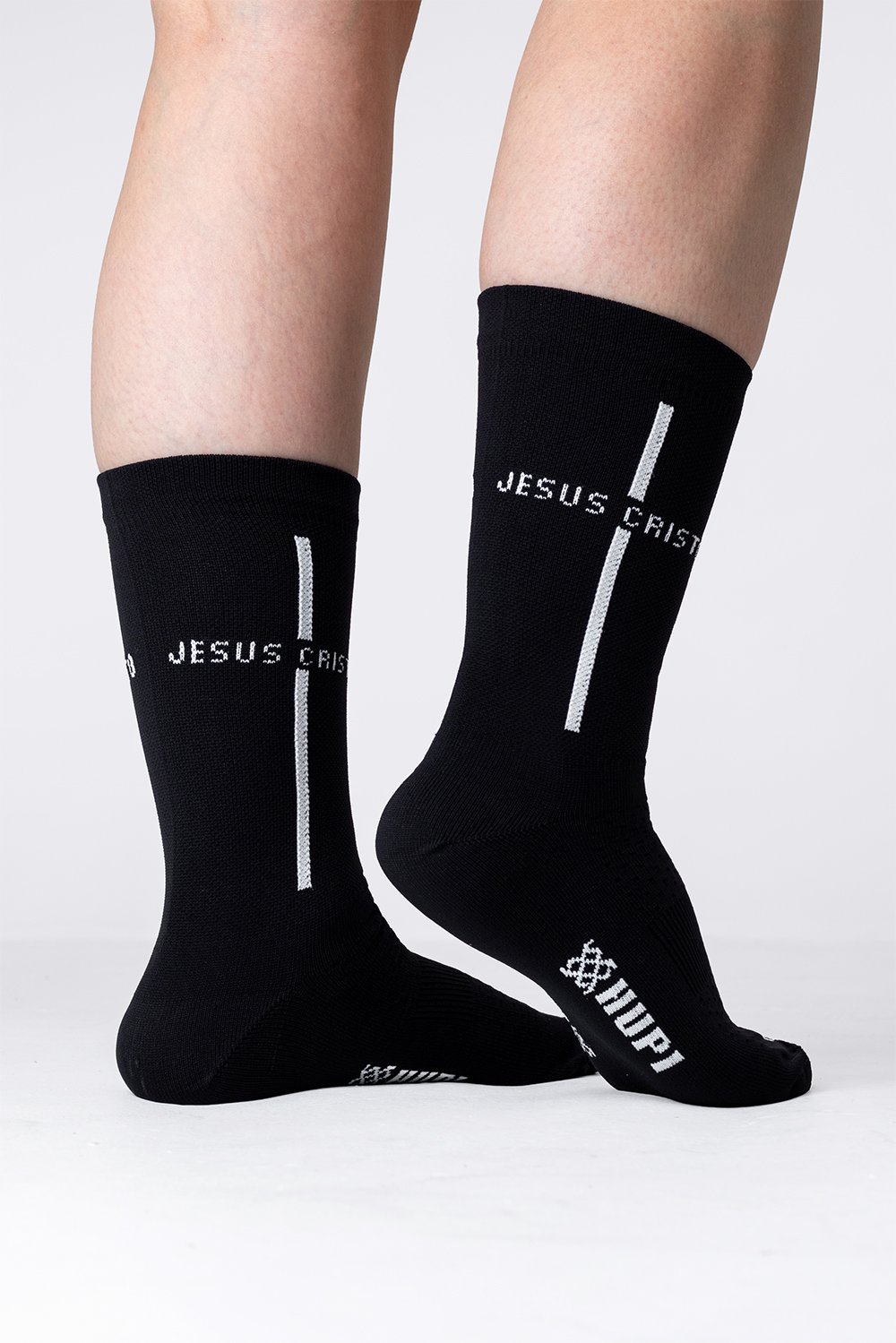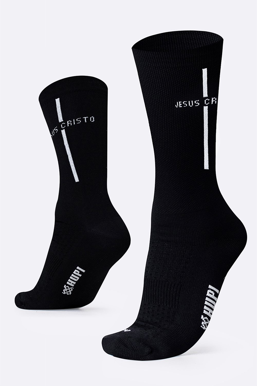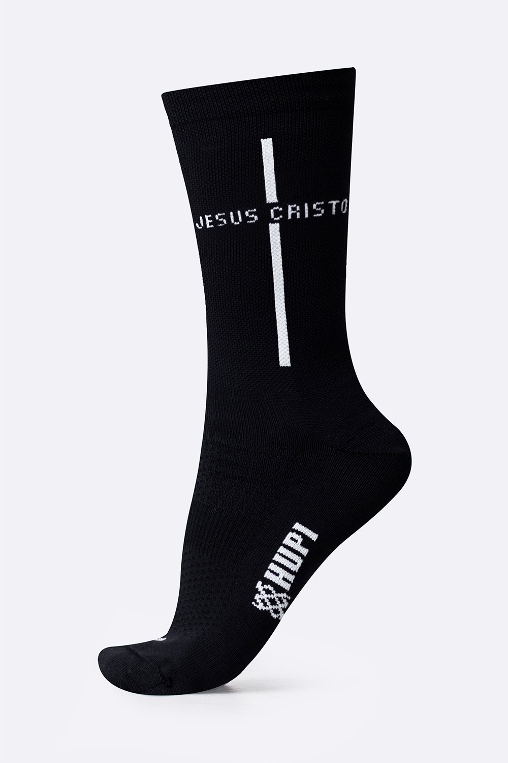 A Meia HUPI Jesus Cristo Preto Branco une tecnologia, conforto e resistência, sendo a escolha perfeita para quem busca desempenho superior e um ajuste perfeito.