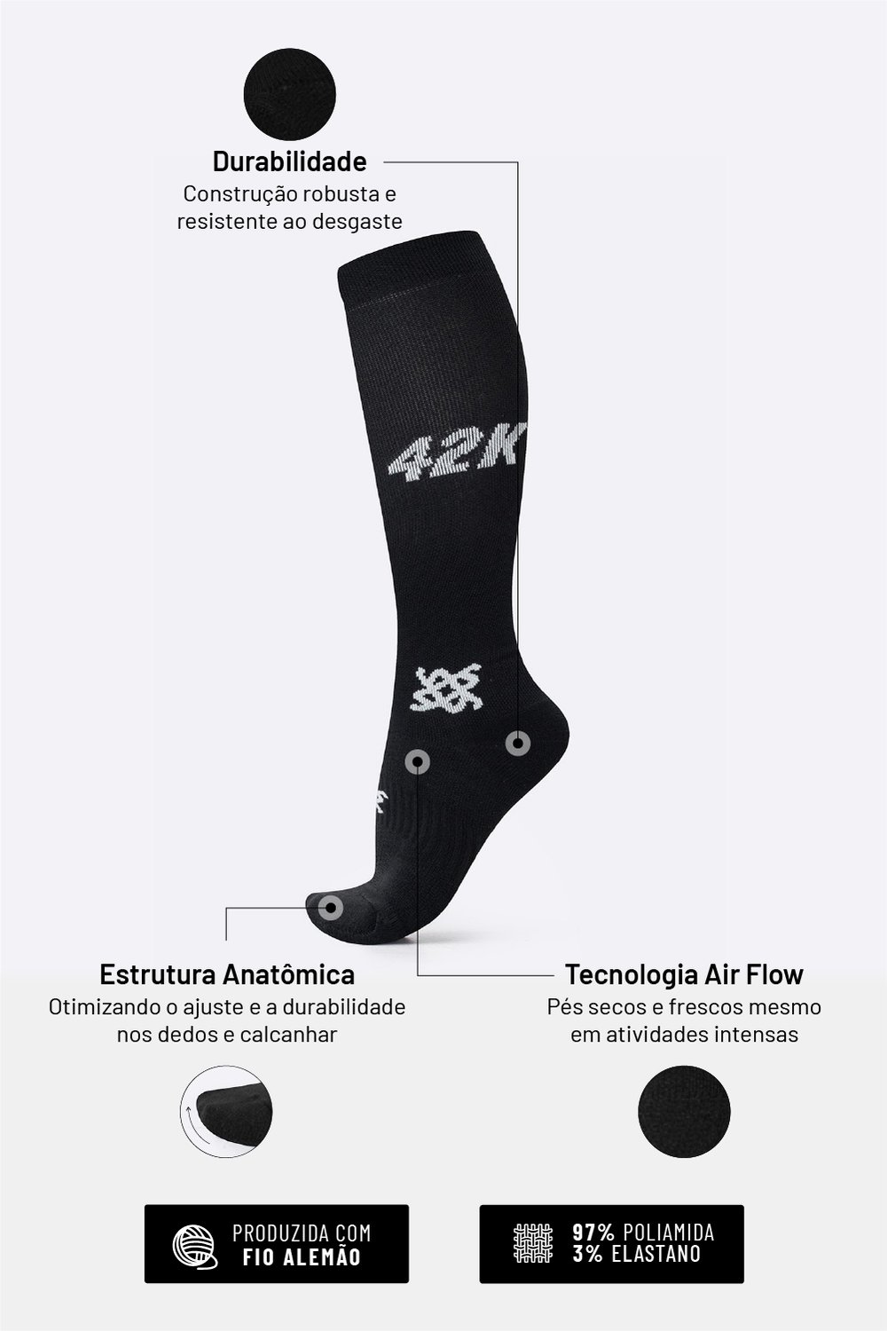 Praticar esportes com conforto e máximo desempenho é o seu objetivo, e também o nosso. Por isso a meia apresenta diversos destaques que fazem dela um item fundamental.